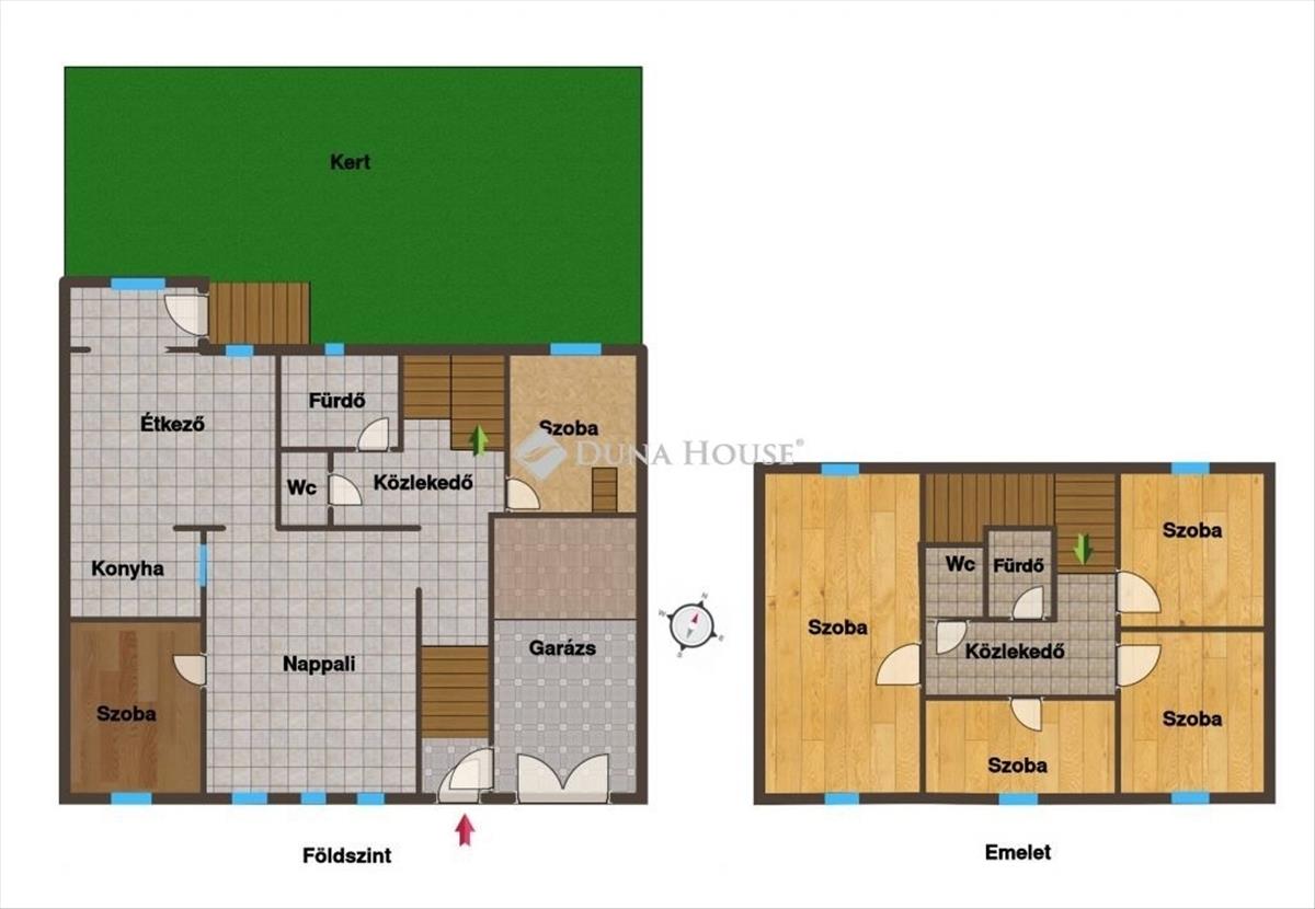 Az emeleten a nappalin kívül 2 egész, egy félszoba, egy fürdő és egy wc lett kialakítva, így akár generációk összeköltözésére is ideáli az épület.