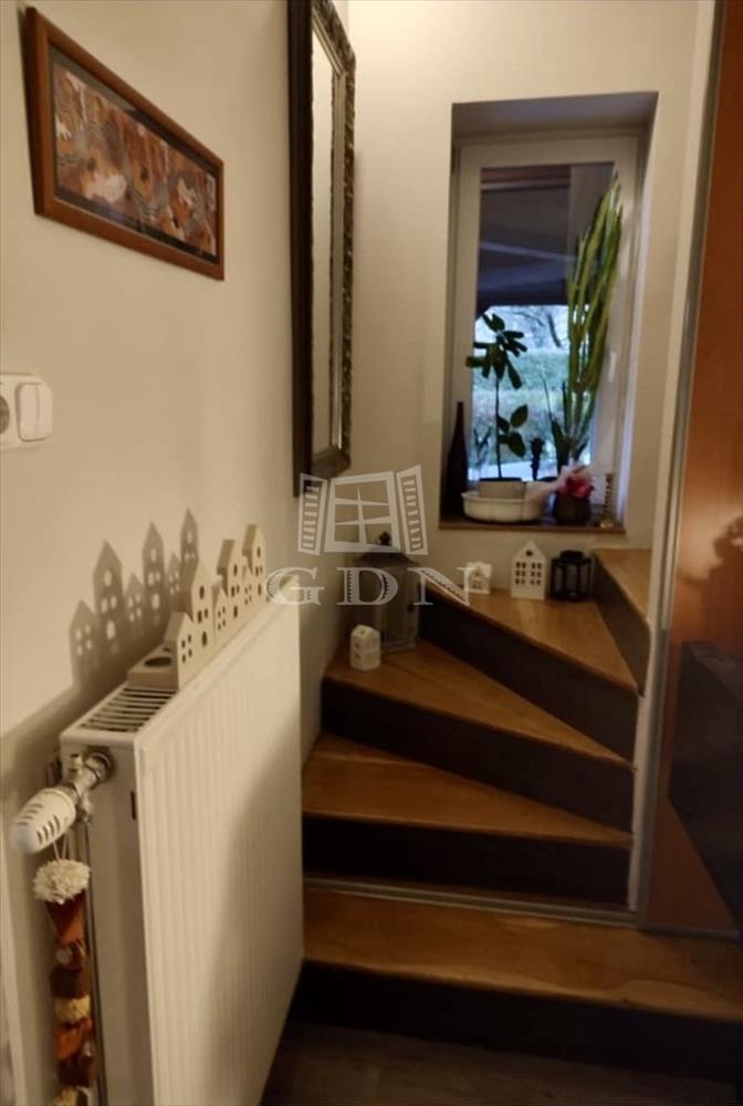A felső szintre vezető lépcső aljában tolóajtó, mely igény esetén elszeparálja a két szintet.