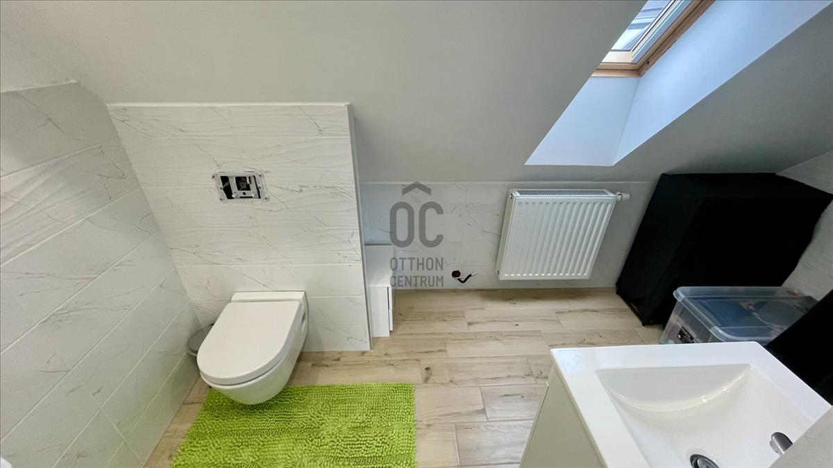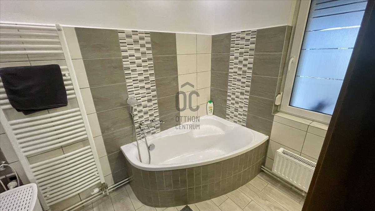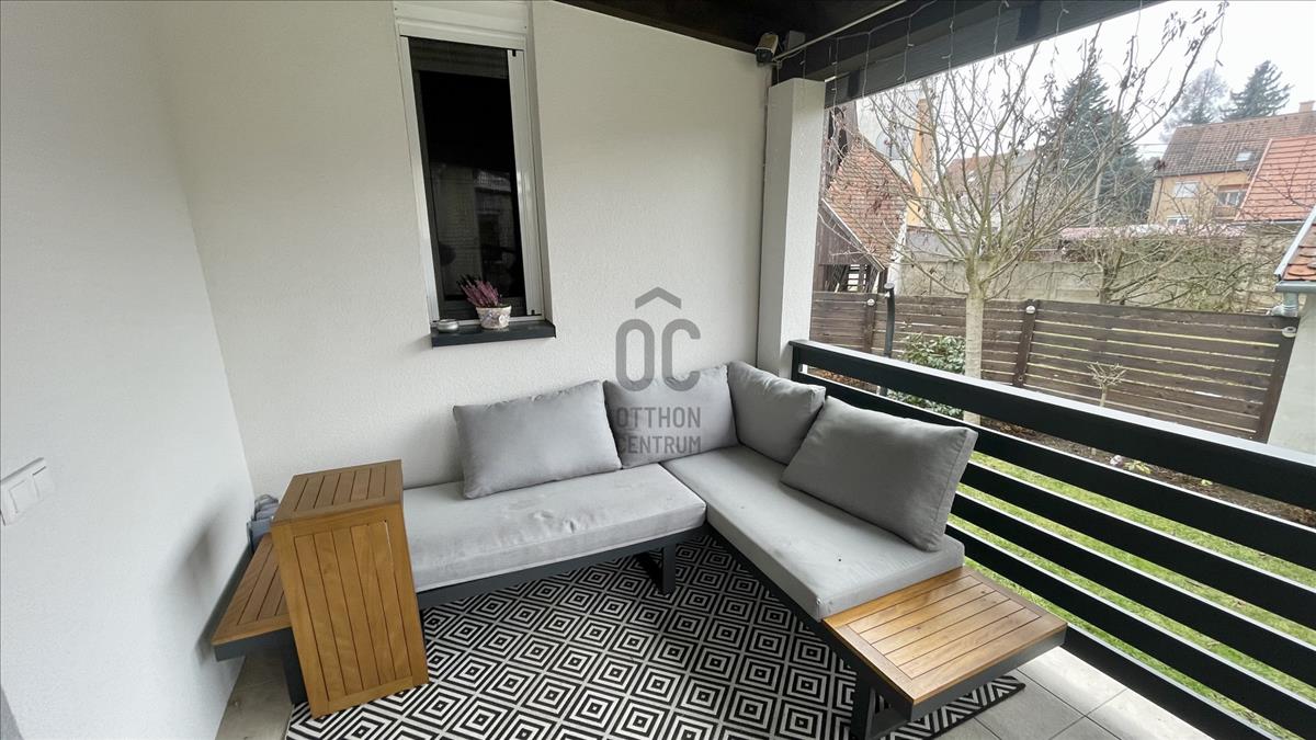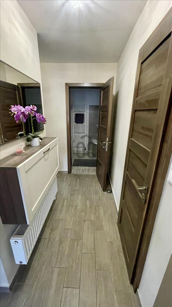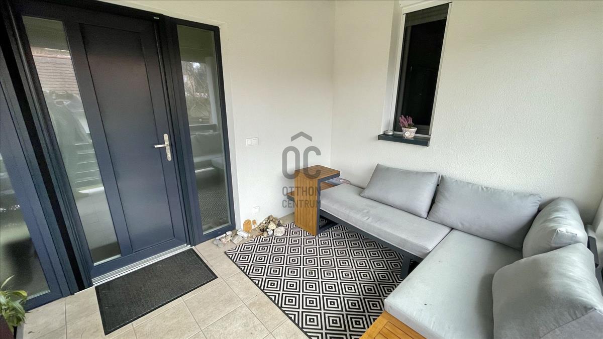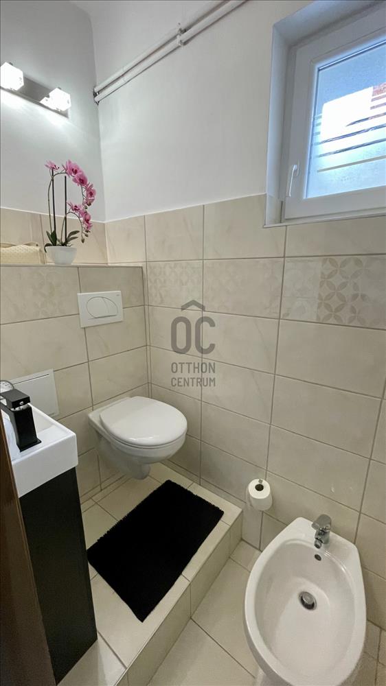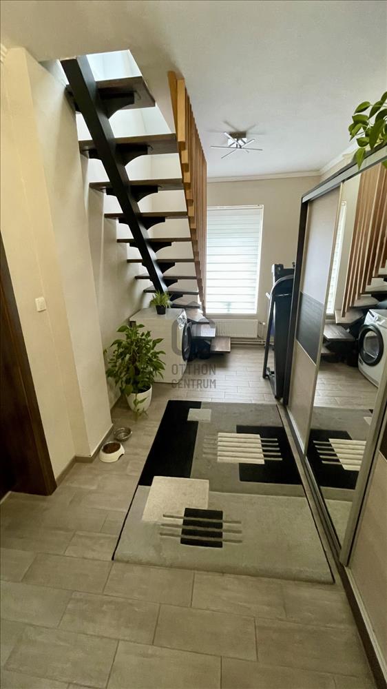A modern stílusú ingatlan ízléses burkolatokkal, beltéri ajtókkal, konyhabútorral beépített.