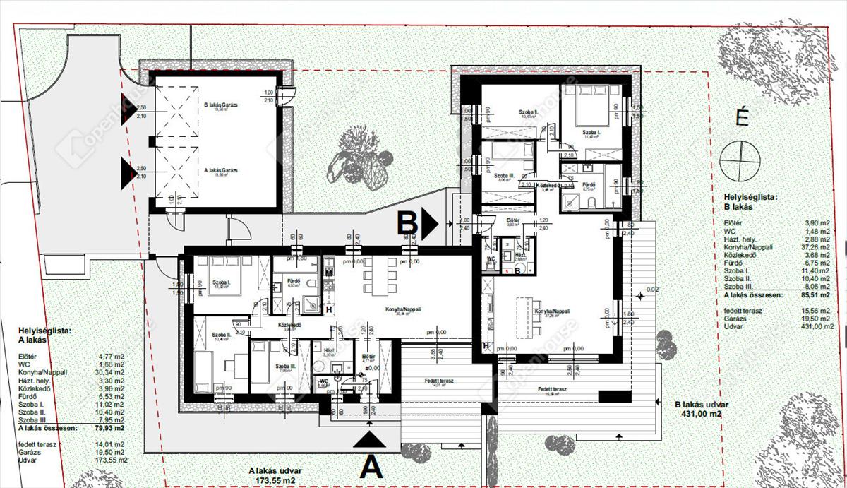 Az a épület 79, 93 négyzetméter alapterületű, melyhez egy 14, 01 négyzetméteres fedett terasz, valamint egy 173, 55 négyzetméteres telek tartozik.