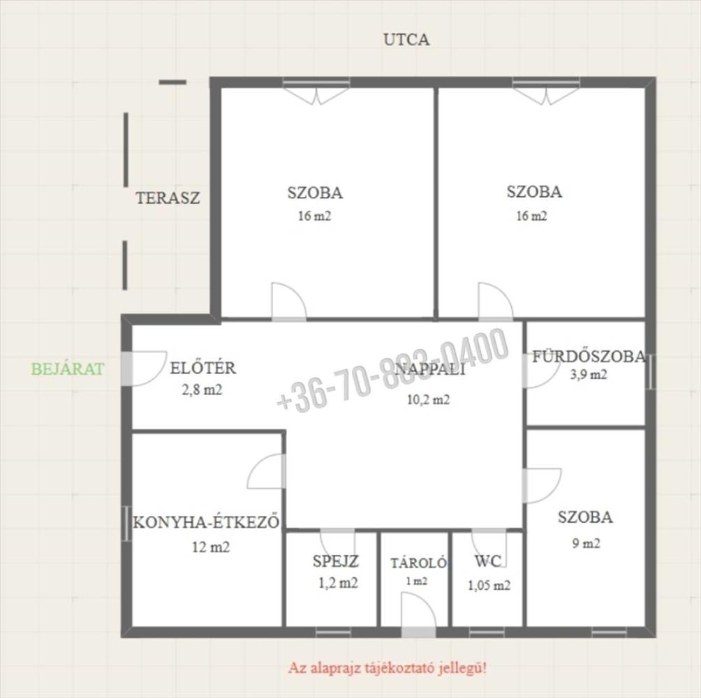 A nettó 72 m2-es ingatlanban 3 hálószoba, konyha-étkező, nappali, fürdőszoba, mellékhelyiség, spejz található.