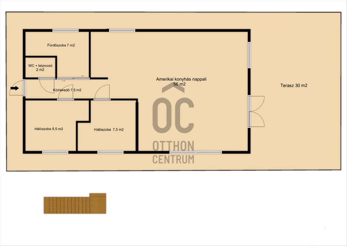 Egy 52, 5 nm-es amerikai konyhás nappali, két hálószoba, fürdőszoba, valamint egy kb. 30 Nm-es, panorámás, fedett terasz, amely körbeöleli az egész szintet, lenyűgöző kilátással a környező mezőkre.
