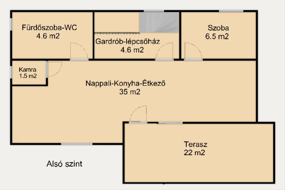 Alsó szint: Nappali + konyha + étkező - 35 m2, zuhanyzós fürdő-WC: 4, 56 m2, vendég szoba: 6, 5 m2, gardrób: 4. 6 m2