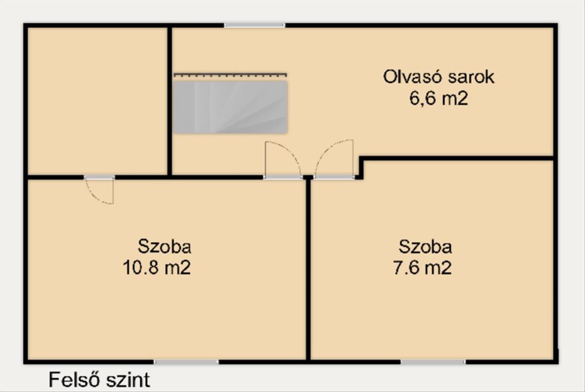 Felső szint: közlekedő-előtér: 6, 6 m2, Szoba: 10, 8 m2, szoba: 7, 6 m2,