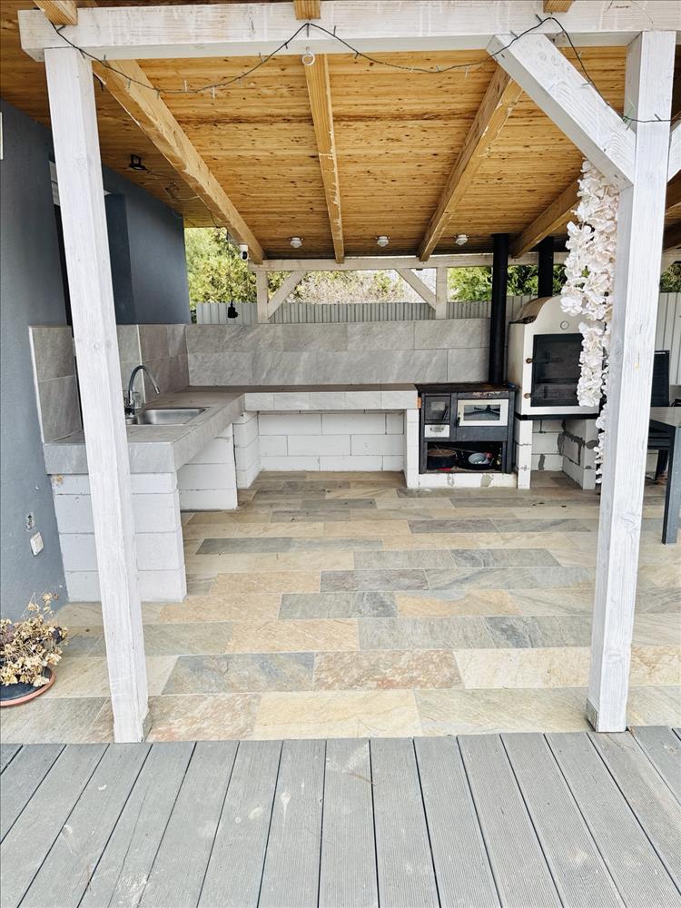 - nagy terasz fedett sütögető résszel és kemencével