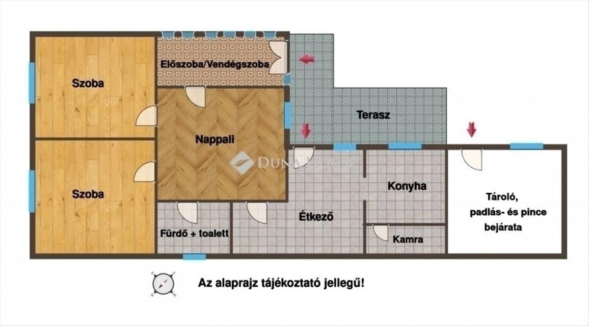 A házba két külön bejáraton is bejuthatunk: a nagyobb előszoba jelenleg vendégszobaként funkcionál, a másik bejárat pedig az étkezőbe vezet. a nappaliból külön nyílnak a tágas, hajópadlóval burkolt hálószobák, így nem egymáson átjárva kell közlekedni.