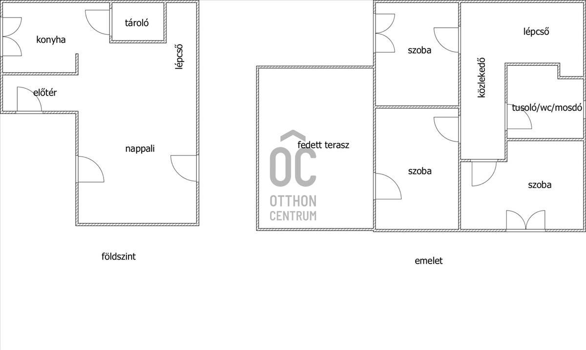 - Földszint: nappali–étkező, előszoba, konyha, mosókonyha