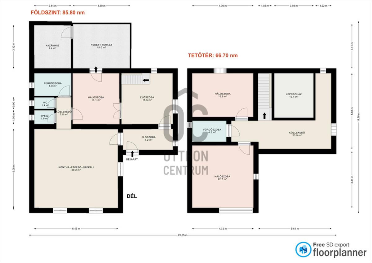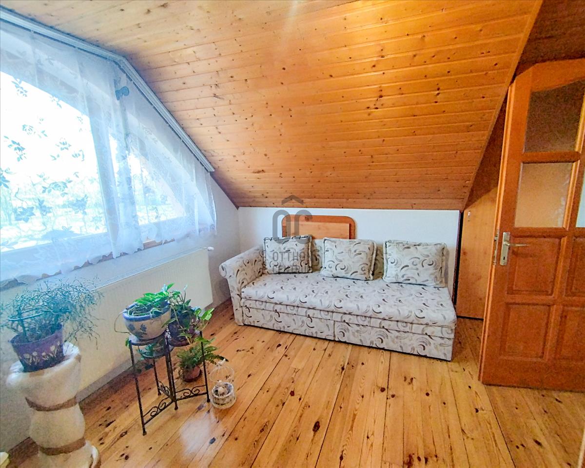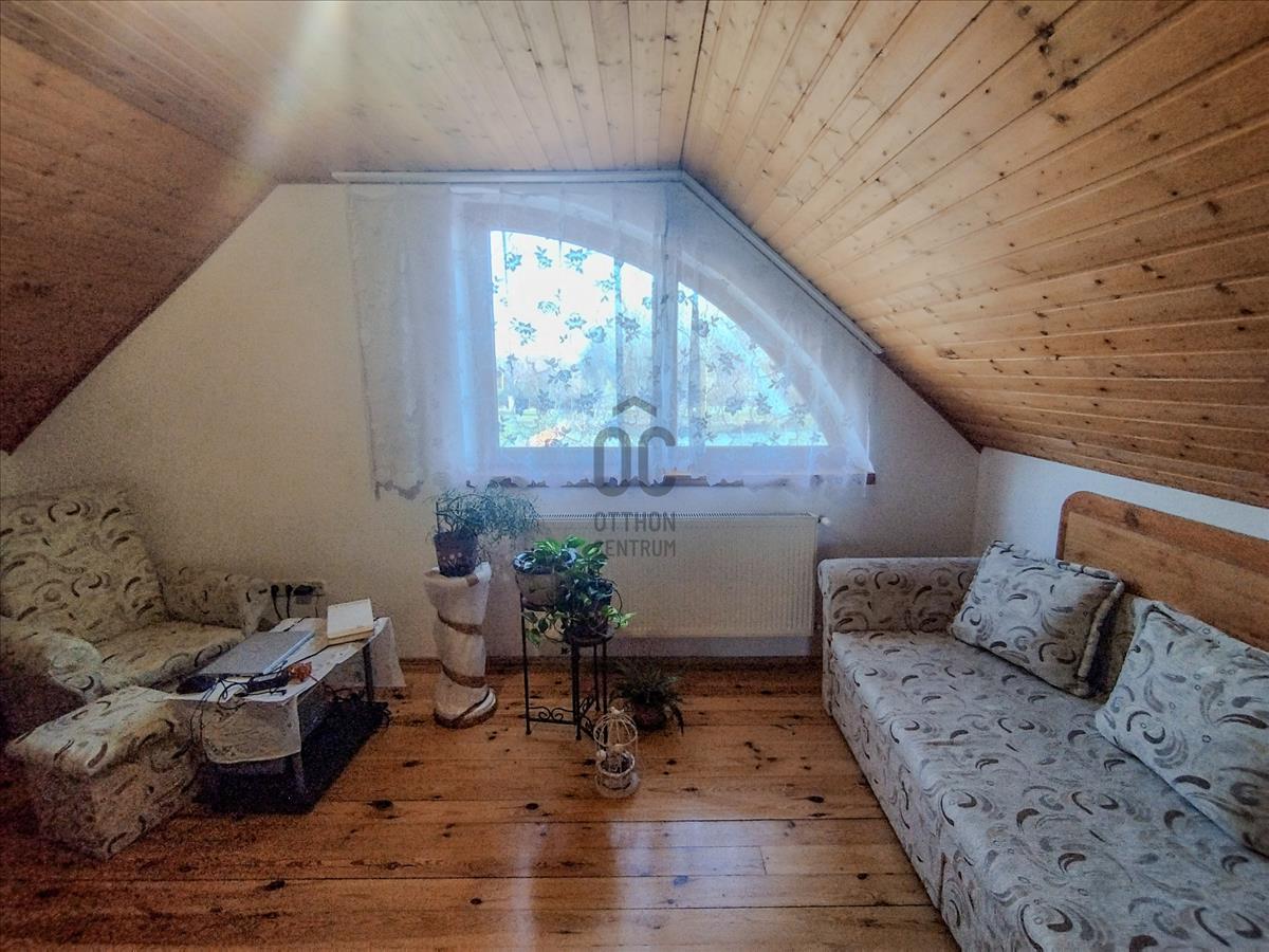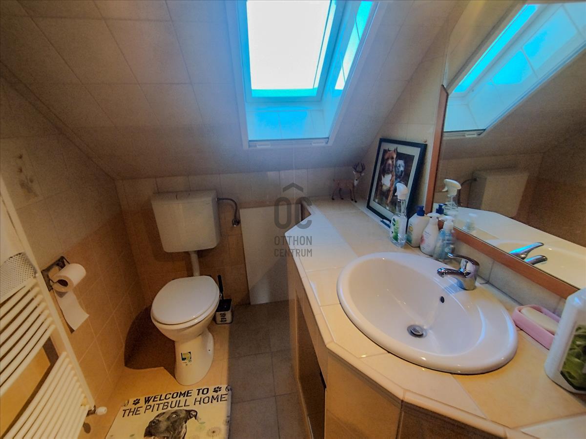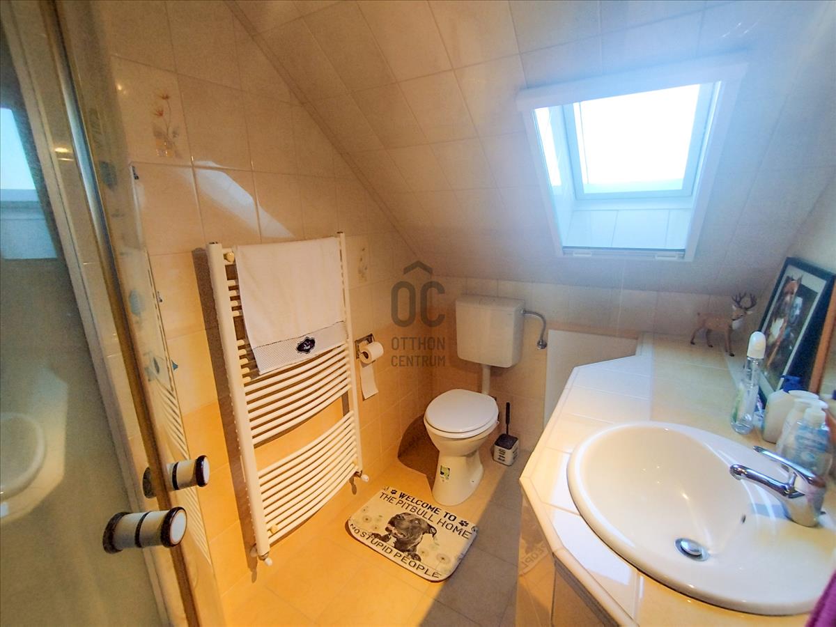 A felső tetőtéri szinten kettő külön nyíló hálószoba biztosítja a kényelmet, és egy nagyobb közlekedő valamint egy fürdőszoba+WC helyiség található.