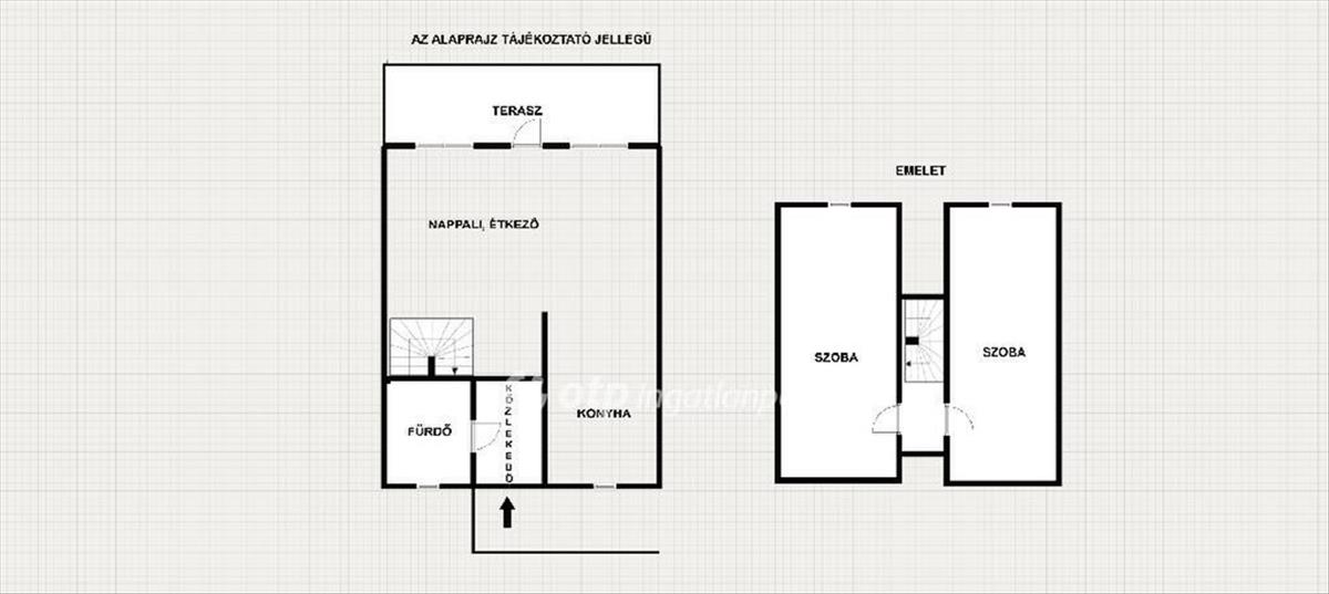 A földszinten egy 10 nm-es fedett terasz, közlekedő, nappali-konyha, valamint egy fürdőszoba WC-vel található.