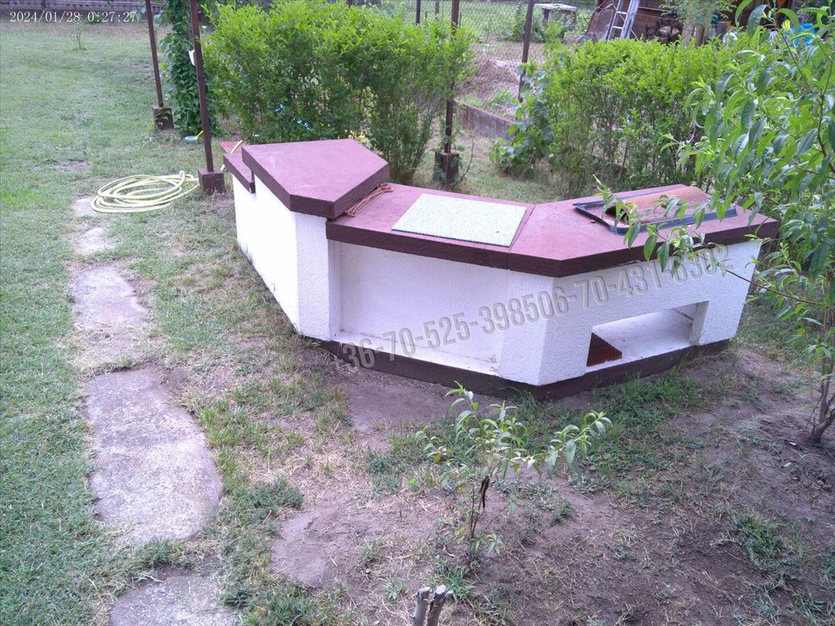 Az udvaron kerti sütő és épített asztal áll, fedett gépkocsi beálló is rendelkezésre áll. Az udvaron számos örökzöld él, gyermek játszótér és medence is elfér.