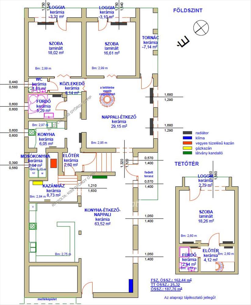 Fűtés: gázkazán és vegyes tüzelésű kazán radiátorokkal, új nappaliban hűtő-fűtő klíma.