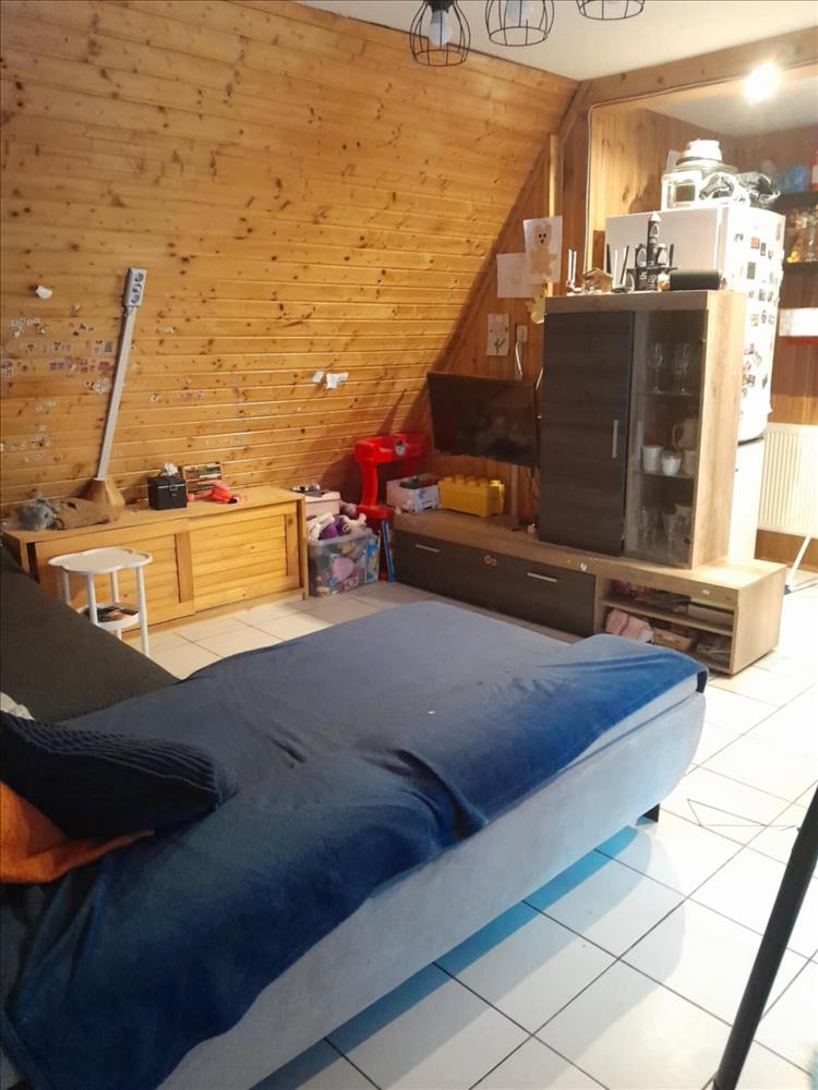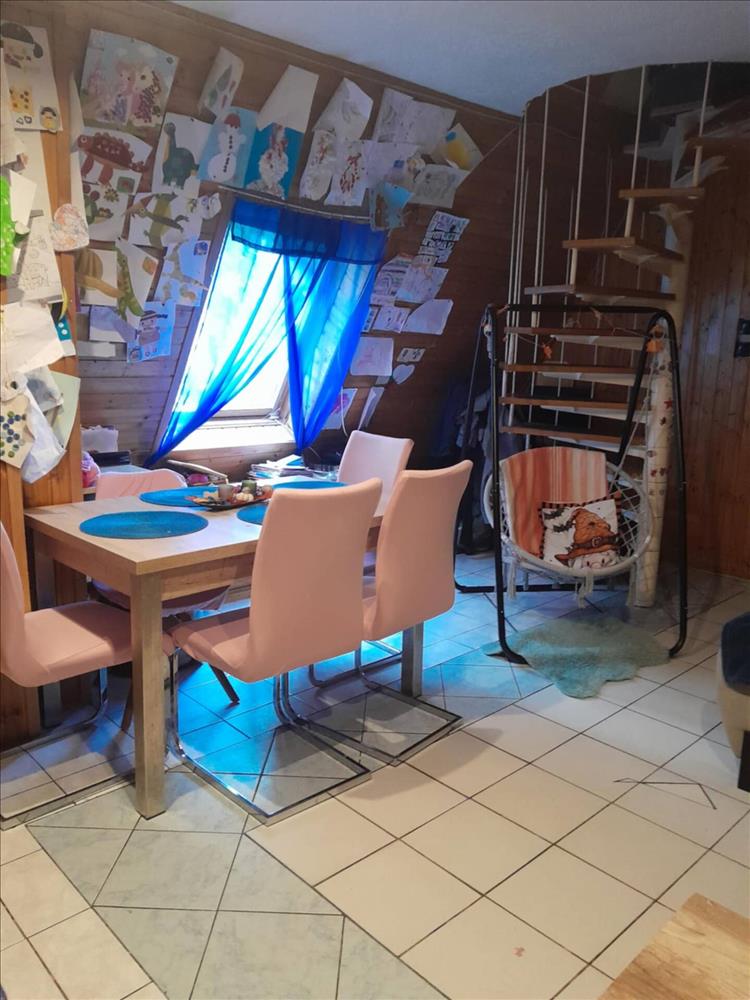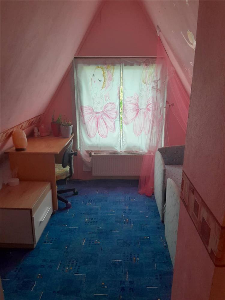 feljutunk egy kis csigalépcsőn az emeleti két félszobába. Majd a nappaliból tágas előszobába érkezünk ahonnan fürdőszoba és a két szoba megközelíthető. Az egyik szoba hatalmas ablakokkal, ajtóval a fedett teraszra vezet, mely kb. 15 Nm. a kertben kerti sütőnek lett kialakítva hely, illetve egy beton alapon álló tároló is megtalálható. a kertben több autóval van lehetőség parkolni!