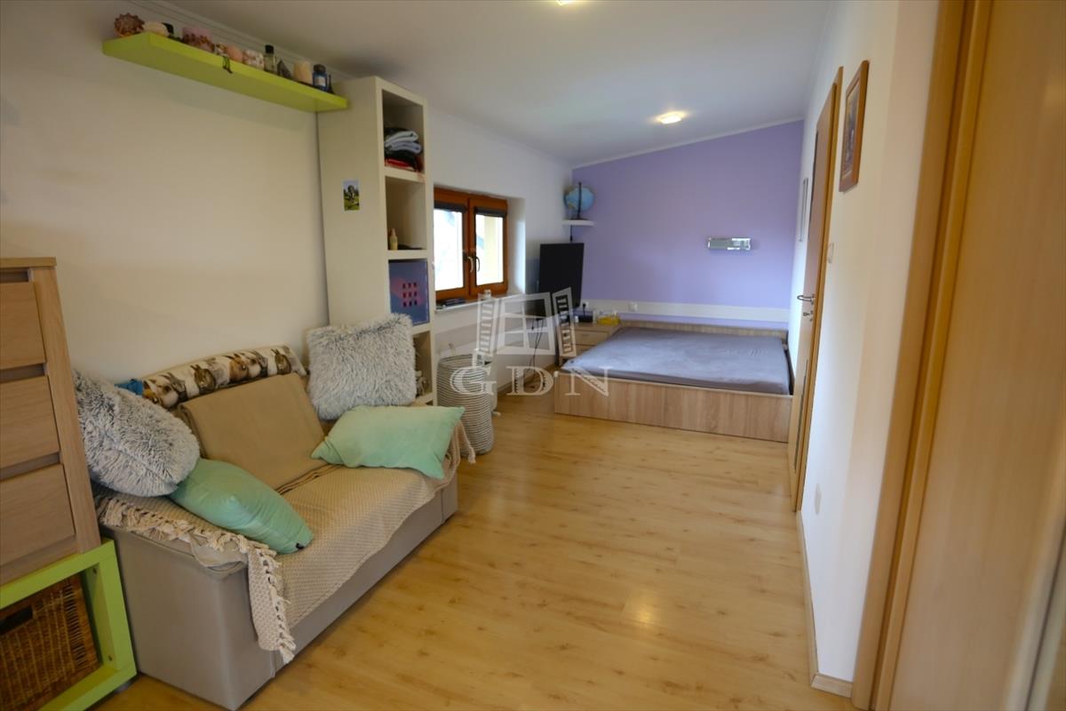 az emeleten négy világos hálószoba kapott helyet, valamint egy zuhanyzós fürdőszoba és egy különálló vizes helyiség is szolgálja a kényelmet. Ugyanitt található a garázs felett kialakított, 60 m²-es beépítésre előkészített tetőtér, amely akár egy külön bejáratú lakássá is átalakítható – ideális többgenerációs együttéléshez vagy irodai funkcióra.