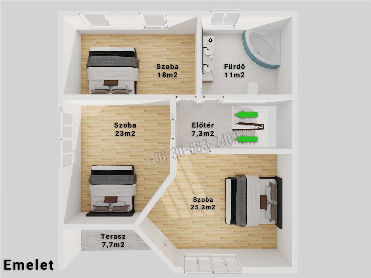 Szoba: 25 m² (30 m² bruttó)