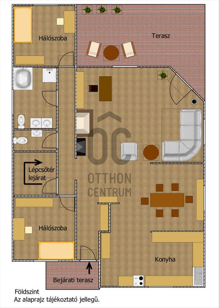A földszinten igényes ízléssel kialakított kandallós nappalit, vele közös térben praktikusan bútorozott gépesített konyhát, étkezőt, két külön bejáratú hálószobát, fürdőszobát és külön WC–t találunk. a nappalihoz intim terasz kapcsolódik, ahonnan szinte az egész kertre rálátunk.