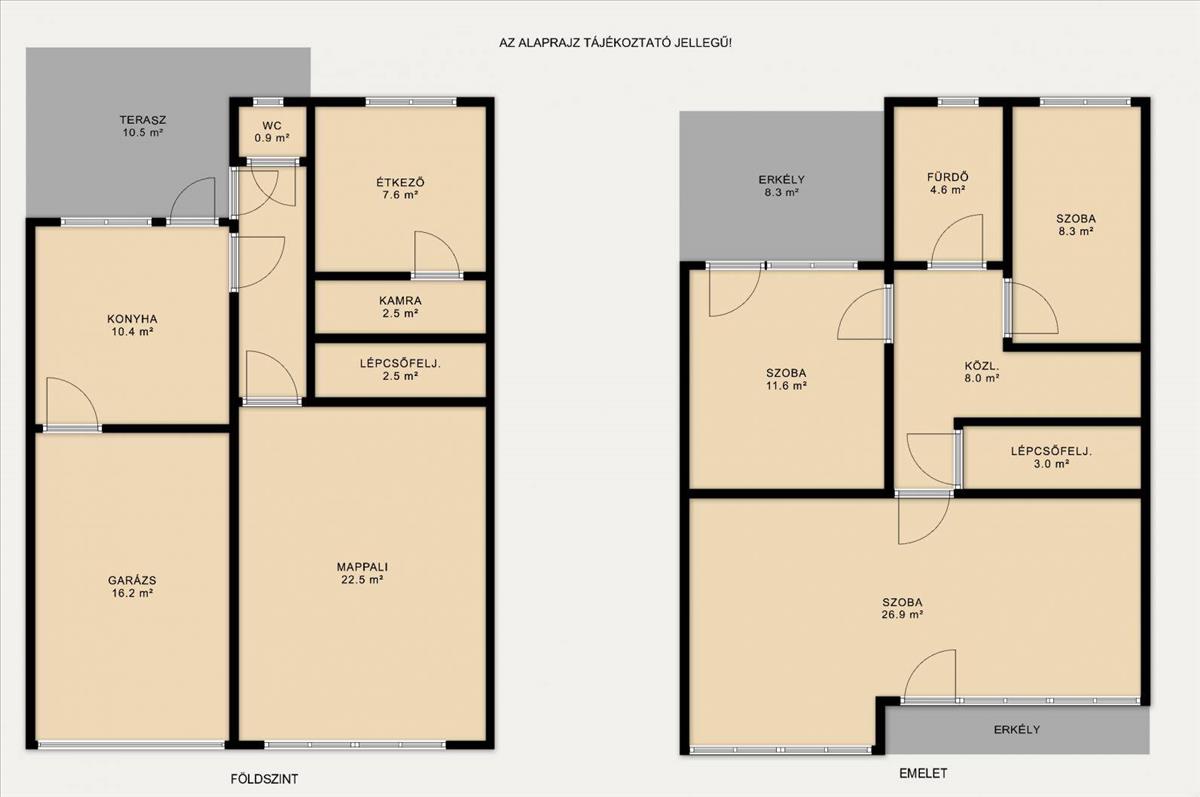 •Földszint: Garázs, tágas étkező, konyha, kamra, kényelmes nappali és egy külön mellékhelyiség.