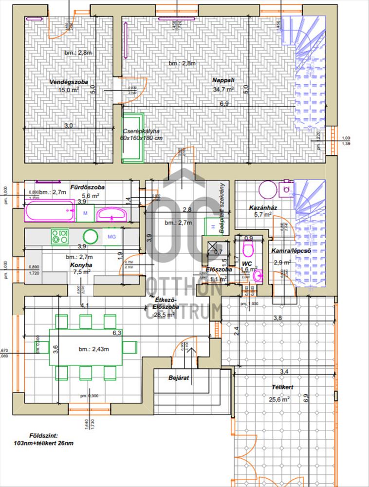 Földszint: Tágas előszoba, étkező, konyha, nappali, hálószoba, wc és fürdőszoba.