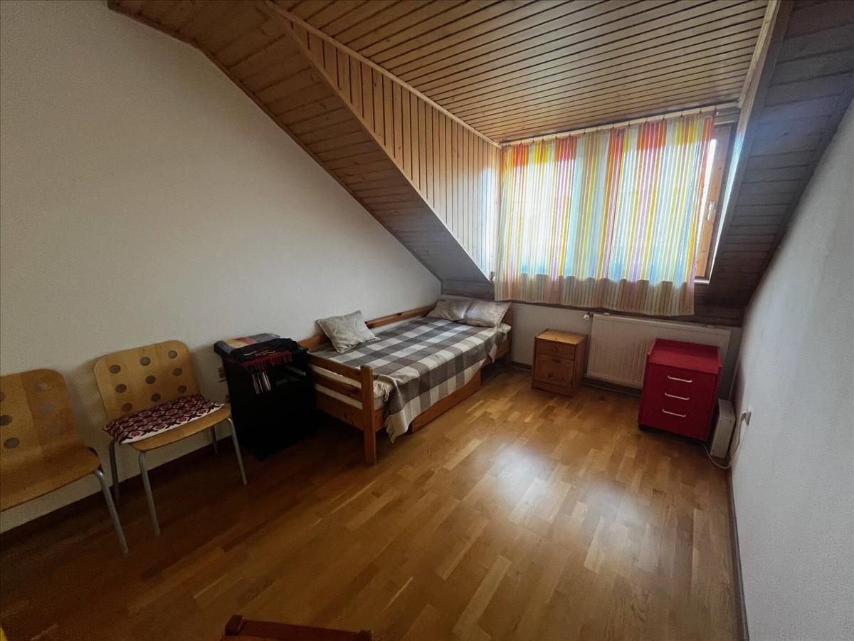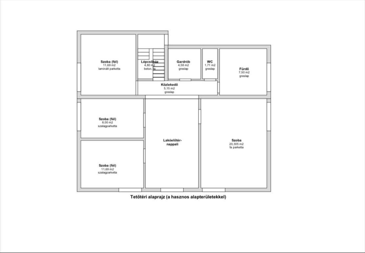 A földszinten tágas nappali, konyha, egy kisebb szoba, fürdőszoba, külön wc, fűtőhelyiség és tároló kapott helyet. Az emeleten négy hálószoba, egy polcozott gardróbszoba, valamint fürdő és wc található. a burkolatok változatosak (parketta, járólap, szalagparketta), a nyílászárók részben műanyagból, részben fából készültek, kétrétegű üvegezéssel, részben redőnnyel és szúnyoghálóval felszerelve. a beltéri ajtók mind fából készültek, az emeleten üvegezett faajtók teszik világosabbá a tereket.