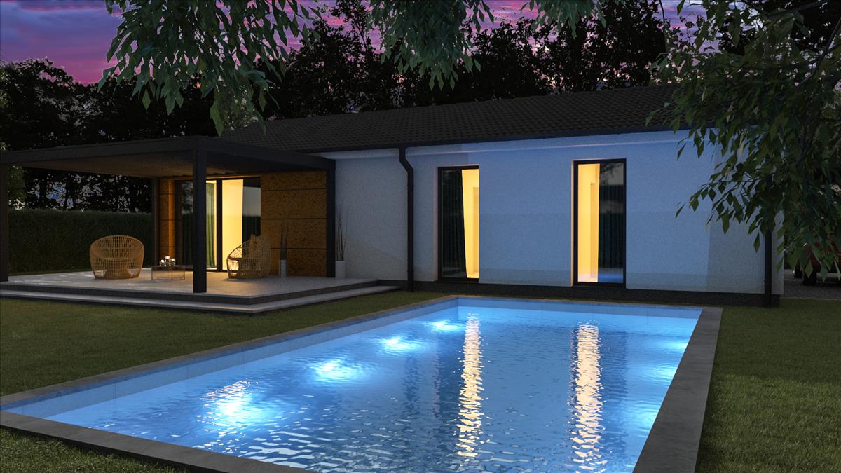 Nappali + 3 hálószoba, nagy üvegfelületek, klasszikus formavilág, többféle külső design lehetőség.