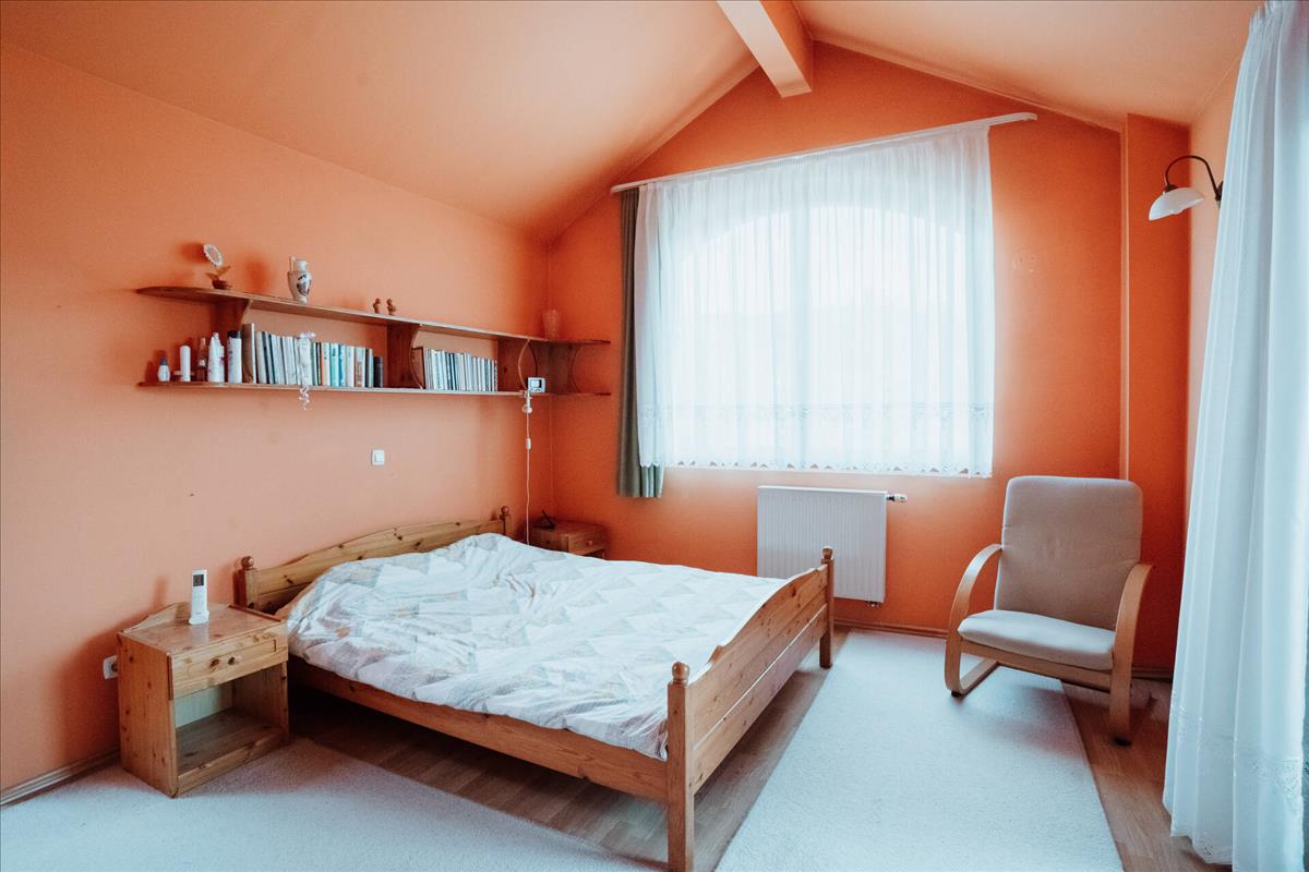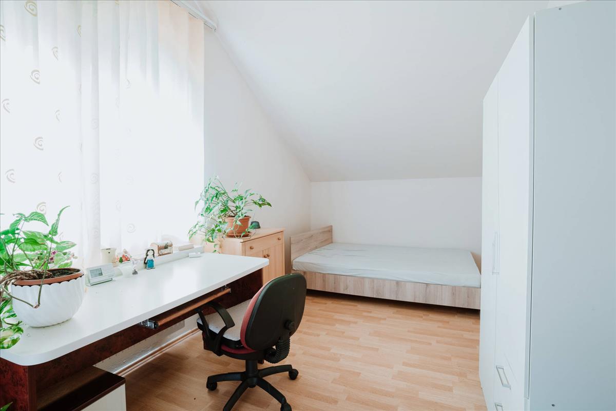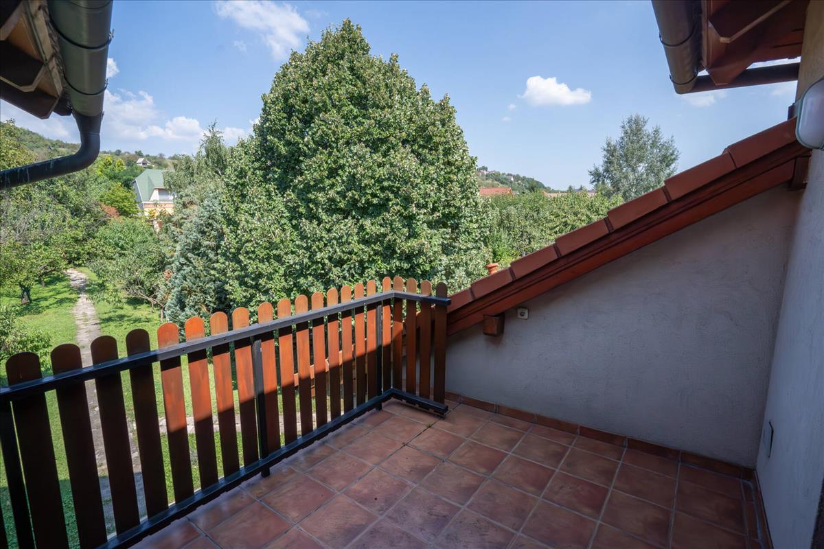 Az emeleten 3 hálószoba kapott helyet, két fürdőszoba és egy háztartási helyiség. Mindegyik hálószobából kiléphetünk valamelyik erkélyre, ahonnan nagyon szép kilátás nyílik a kertre és az utcafrontra.