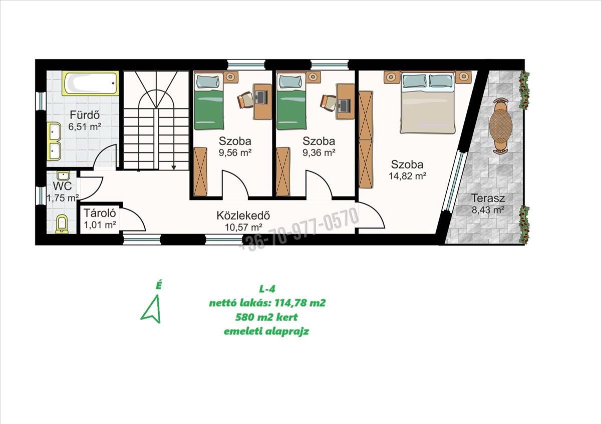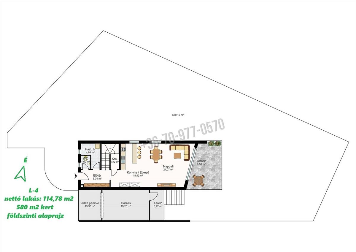 L-4-es; 114, 78 m2 nettó lakótér+terasz+erkély, fedett parkoló, garázs, tároló, 580 m2 kert: 137 M Ft. -