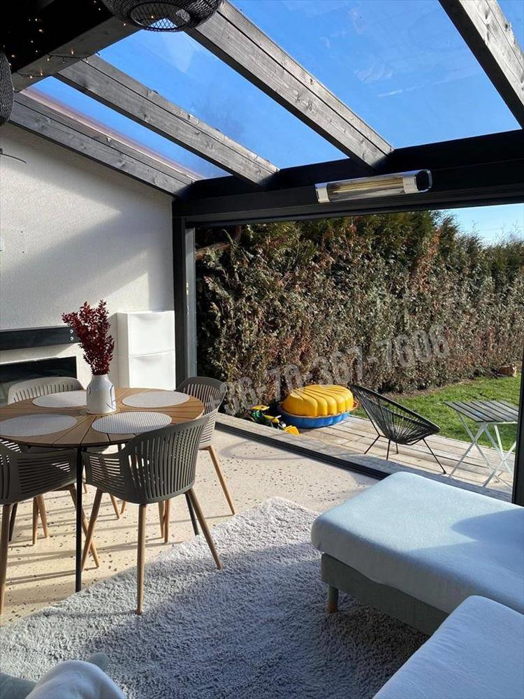 A lakás egyik kiemelkedő előnye a 16 m²-es, teljesen zárt terasz, amely nagy üvegfelületeinek köszönhetően világos, egész évben használható élettér. Padlófűtéssel, kandallóval és elektromos fűtési lehetőséggel is ellátott, ugyanakkor a nappalitól teljesen leválasztható – ideális pihenéshez, dolgozószobának vagy télikertnek.