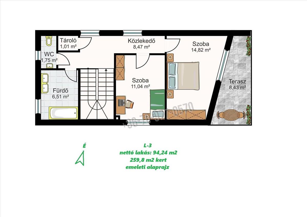 L-3-as; 94, 24 m2 nettó lakótér+terasz+erkély, fedett parkoló, garázs, tároló, 259 m2 kert: 105, 9 M Ft. -