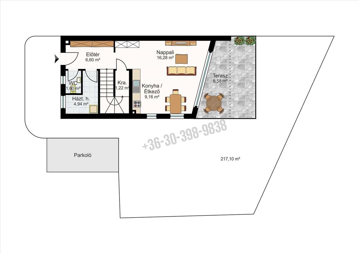 Teraszok: 1 fedett terasz + 1 fedett erkély (földszint + emelet)