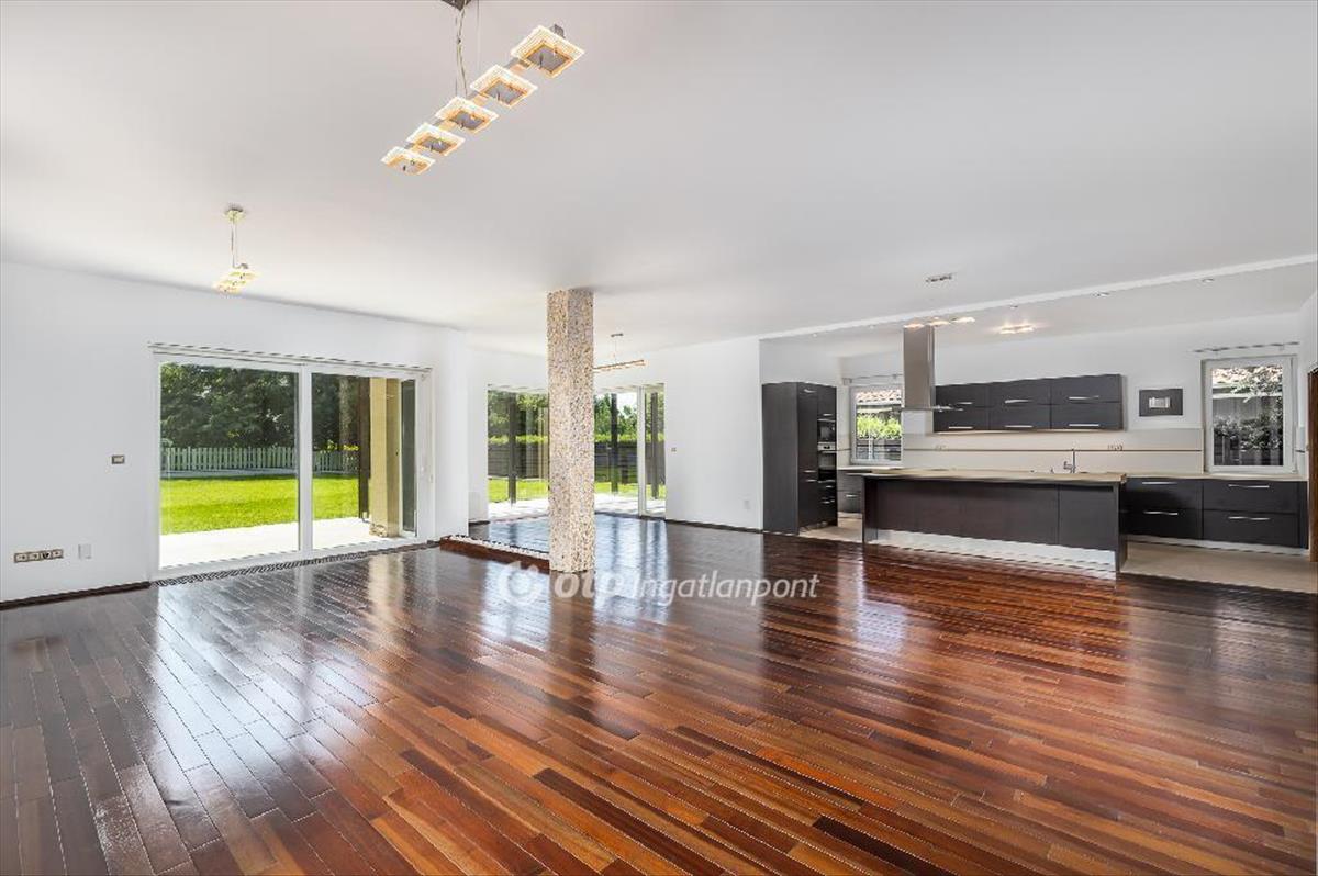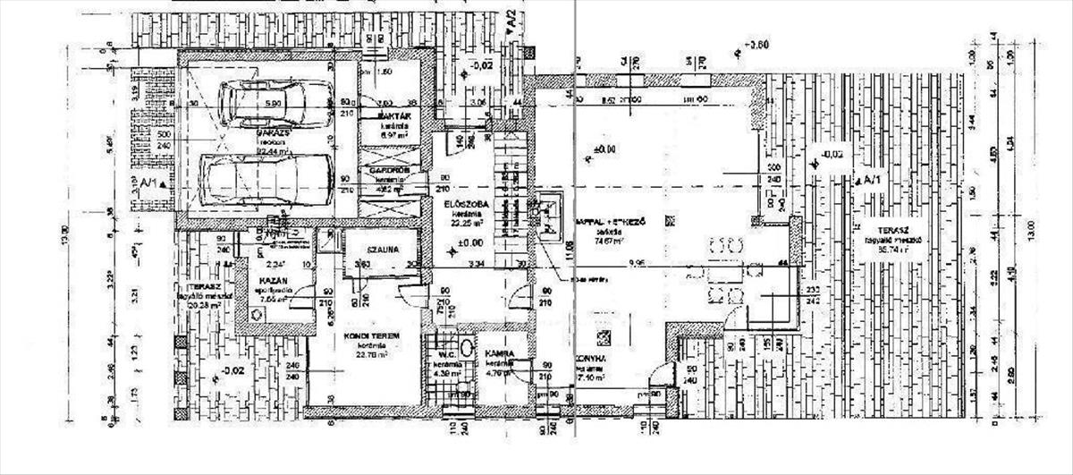 A földszinten található egy 92 nm -es amerikai konyhás nappali, ahonnan kiléphetünk a tágas 60 nm -es teraszra. Ezen a szinten találhatunk még egy hatalmas előteret gardróbbal, konditermet, szaunát, fürdőszobát, kazánházat, illetve szintén innen közelíthetjük meg a kétállásos garázst.