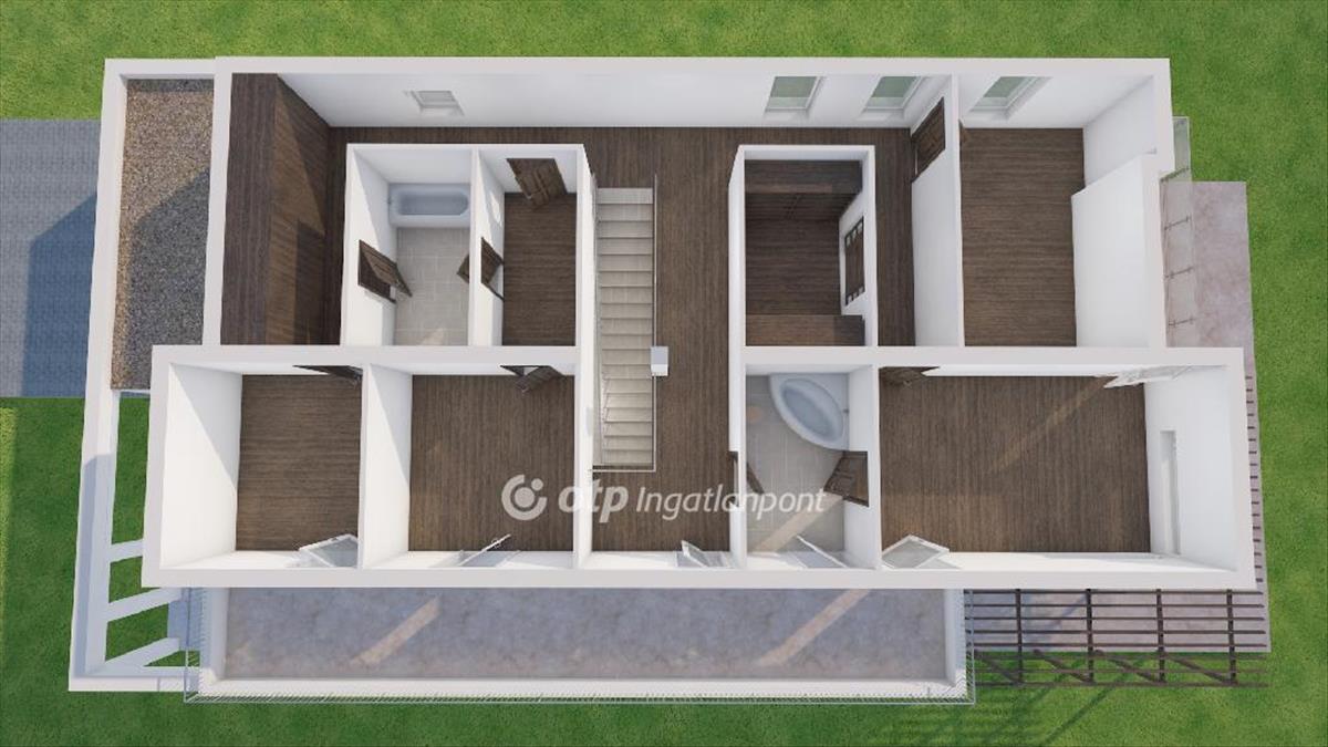 Az emeleten négy tágas hálószoba várja lakóit. Erre a szintre az építész gardróbokat és 2 fürdőszobát helyezett el, illetve itt található a panorámás terasz, amely az összes szobából megközelíthető.