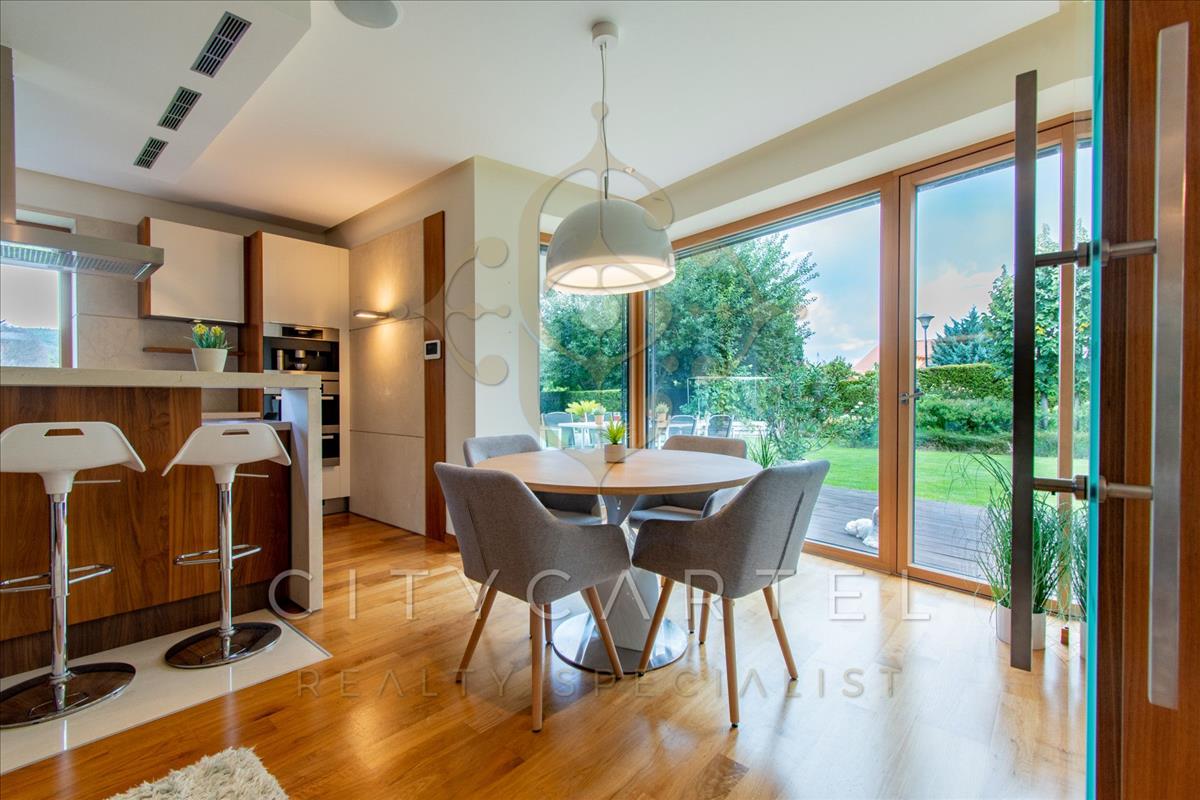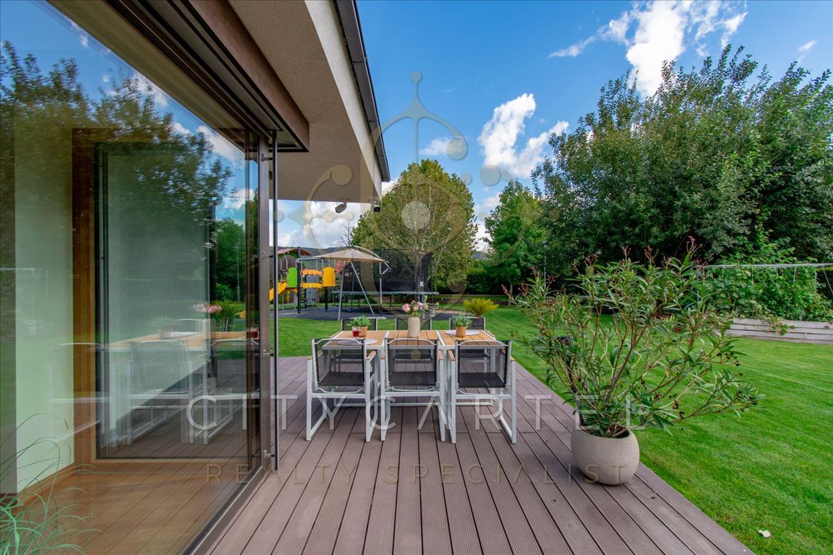 A földszinten a nappali, étkező és a Miele gépekkel felszerelt konyha és a nagyméretű kamra mellett egy játékszoba is helyet kapott, ahol a gyerekeket szemmel tarthatjuk, miközben a felnőttek pihenhetnek a tágas nappaliban vagy élvezhetik a kültéri teraszok nyújtotta kényelmet, amit mindegyik helyiségből el lehet érni.