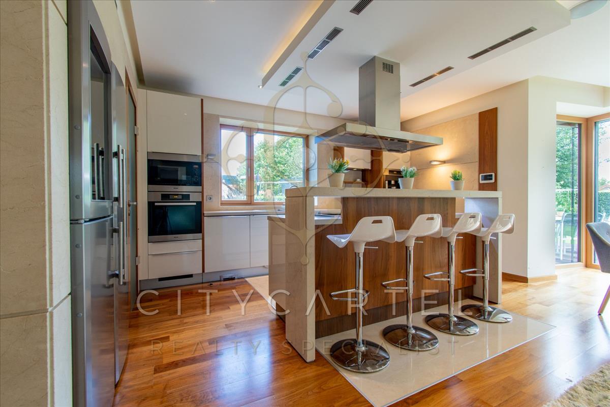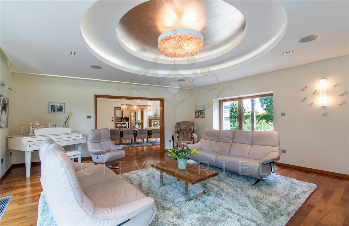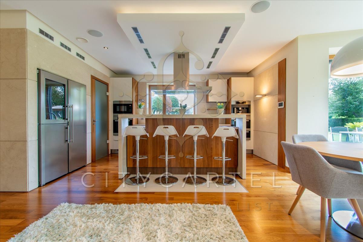 A földszinten található továbbá hálószoba saját fürdőszobával és gardróbbal, dolgozószoba, fürdőszoba onyx kővel, 4 állásos garázs, úszómedence pezsgőfürdővel és minibárral.