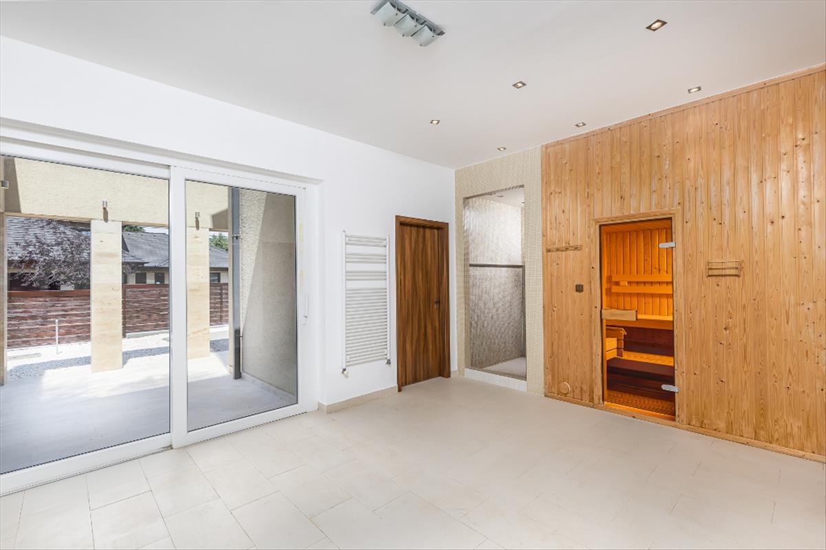 Földszint. :75 Nm méretű nappali-étkező 60 nm terasszal, ( konyhaszigetes, gépesített kamrával) hatalmas előtér gardróbbal, valamint konditerem, fürdőszoba, szauna, kazánház, továbbá két állásos garázs tárolóval.