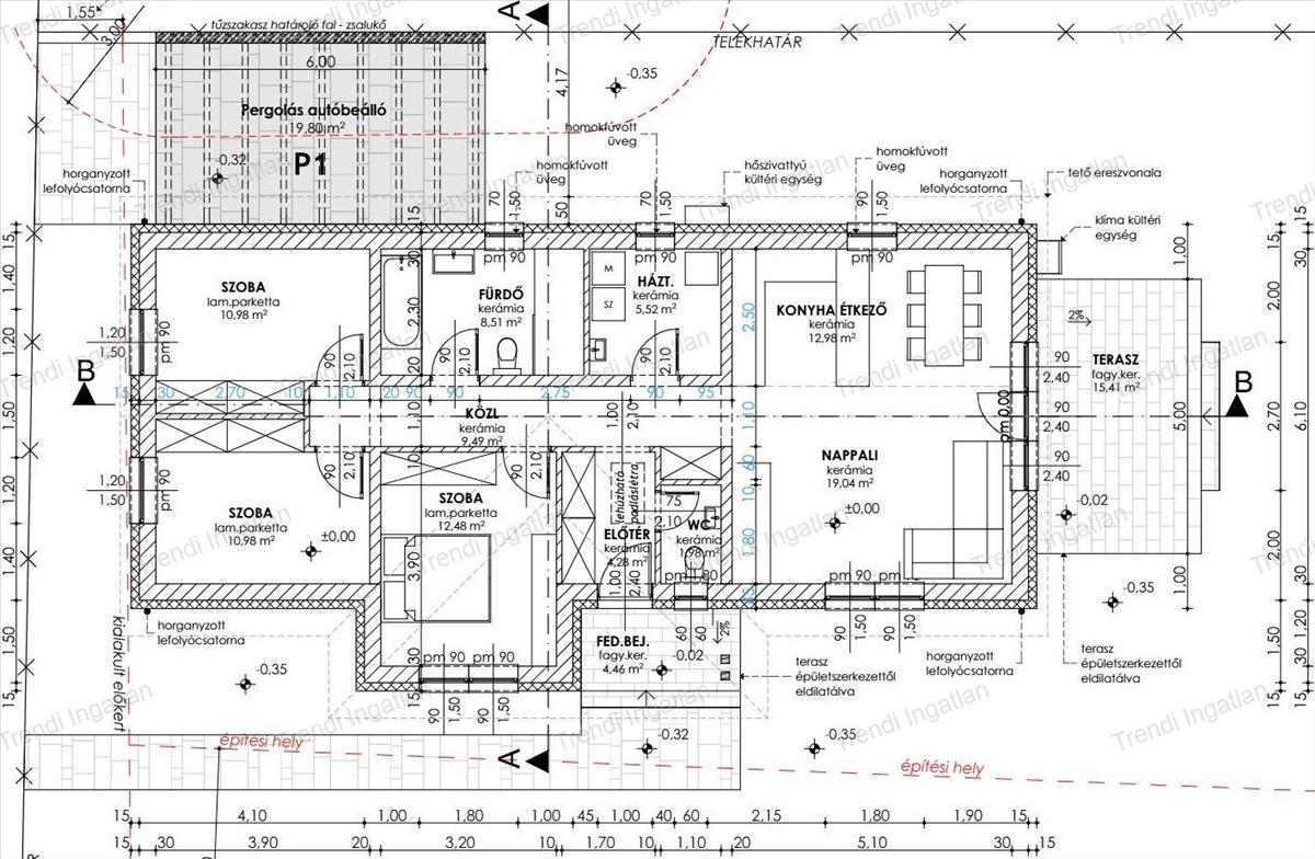Az ingatlan remek elosztású, melyben amerikai konyhás nappali, 3 szoba, fürdőszoba WC-vel, külön wc, háztartási helyiség, közlekedő, előtér került kialakításra. Nappaliból nyílik 15, 41 nm -es terasz.