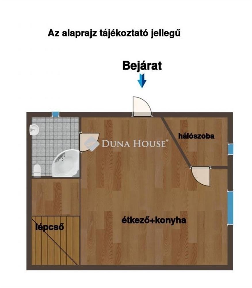 Alsó szint: konyha–étkező, fürdő WC-vel, hálószoba