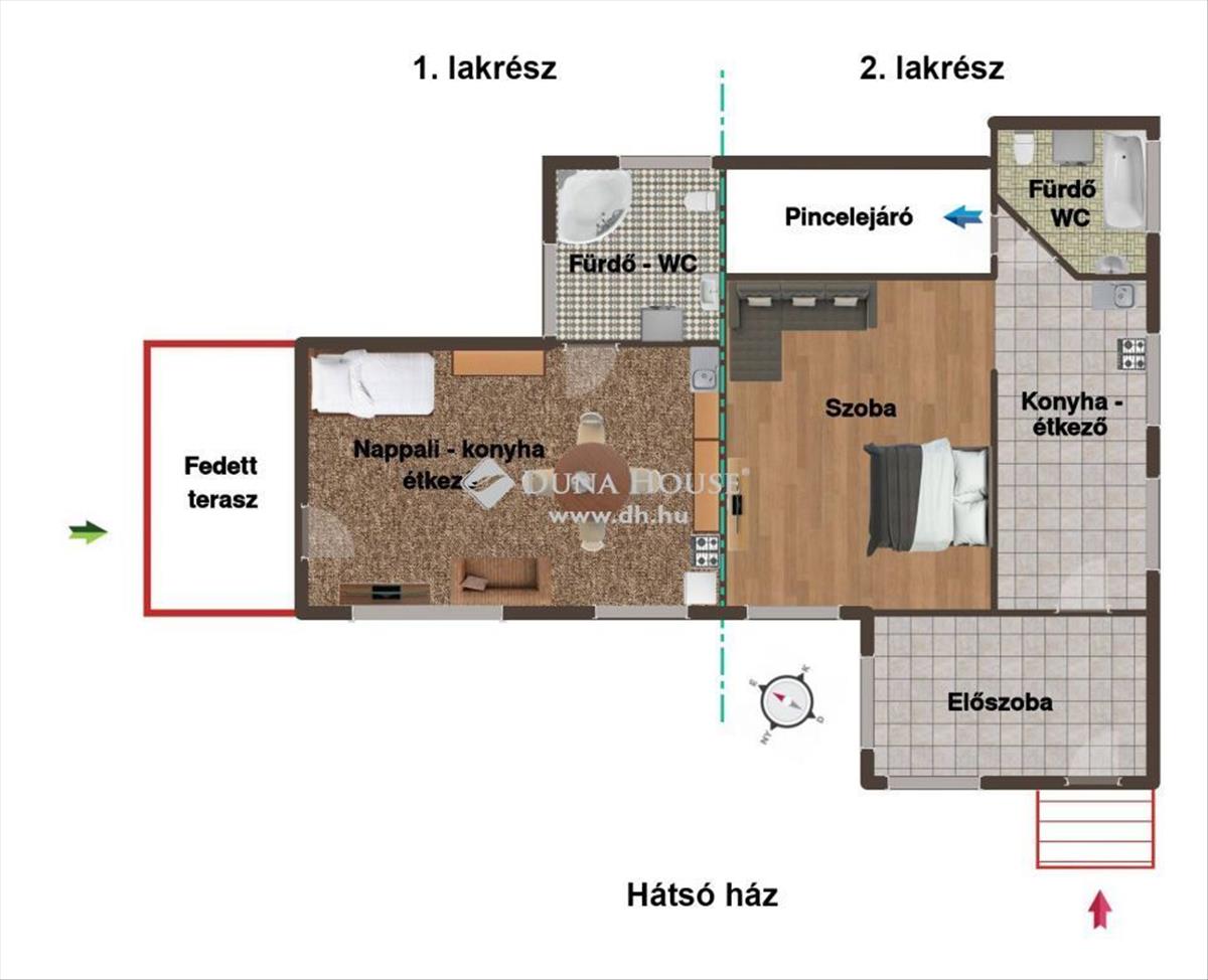 A telek középső területén található egy második épület, melyen belül 2 önálló lakrész került kialakításra. Az első lakrészben szoba, konyha, fürdőszoba található 33 m2-en + 9, 2 m2 fedett terasz, a hátsó lakrészben előszoba, szoba, konyha, fürdőszoba található 47 m2-en + 11 m2 pince.