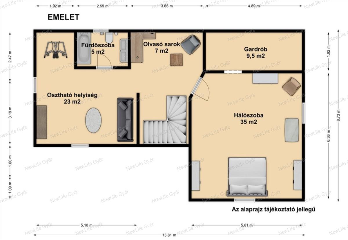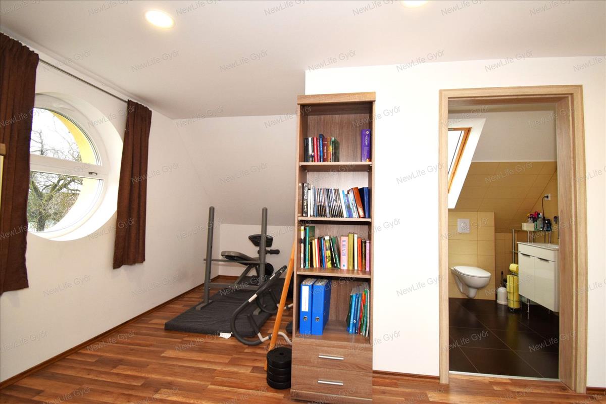 Emelet: egyedi kerek ablakok: tágas hálószoba, gardrób, olvasó sarok, nagyobb L alakú osztható helyiség, akár két szobára, jelenleg egy fitnesz szobaként és egy második nappaliként funkcionál, fürdőszoba káddal, WC-vel.