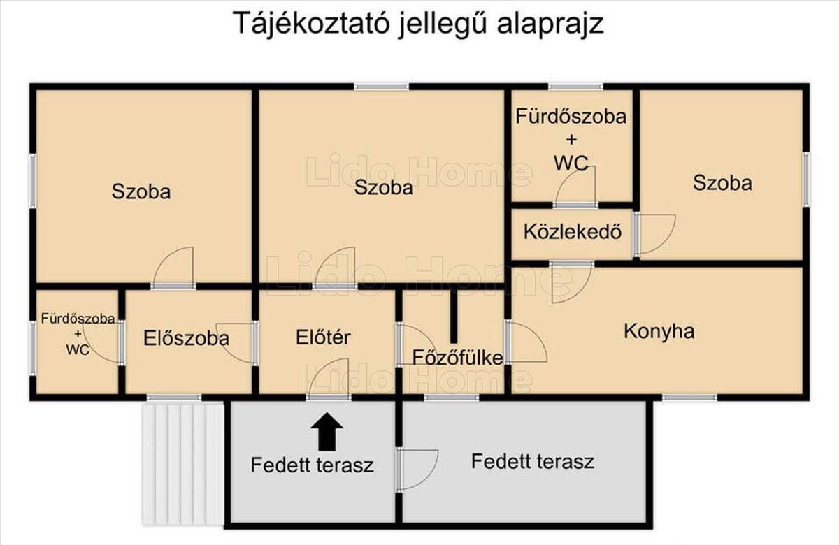 - a házba fedett teraszon át juthatunk. a házban három szoba, egy konyha, egy főzőfülke, két fürdőszoba+wc található, valamint két előszoba található.
