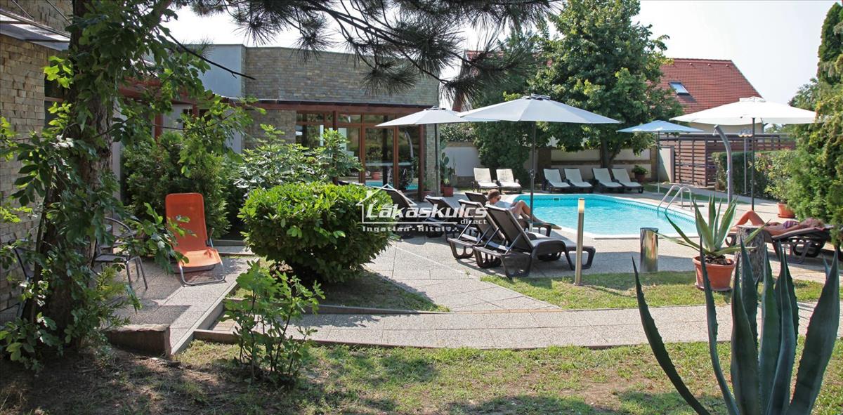 Az ápolt, parkositott kertben fűthető medence/8*4m nagyságú, üvegkristályos szűrőrendszerrel, automata vegyszeradagolóval ellátva.