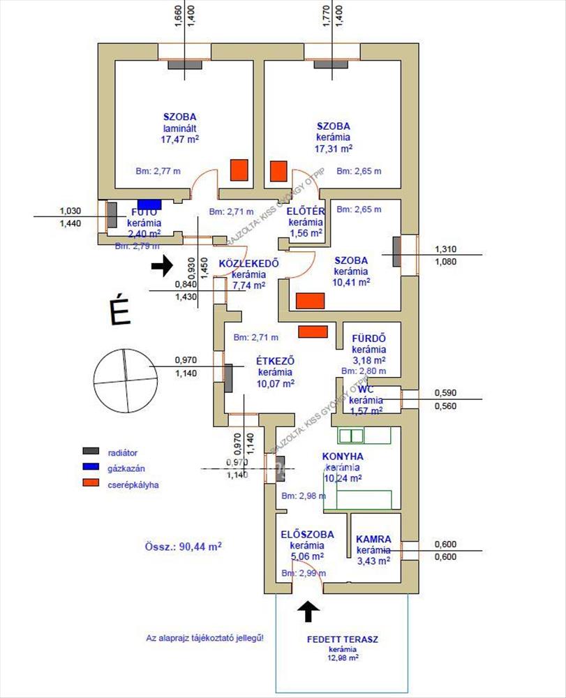 Helyiségek: konyha, étkező, 2 szoba, 1 félszoba, fürdő (kád jelenleg nincs, egyébként összkomfortos lenne), wc (fürdőből nyílik, de külön van), közlekedő, előszoba, előtér, kamra, fűtőhelyiség.