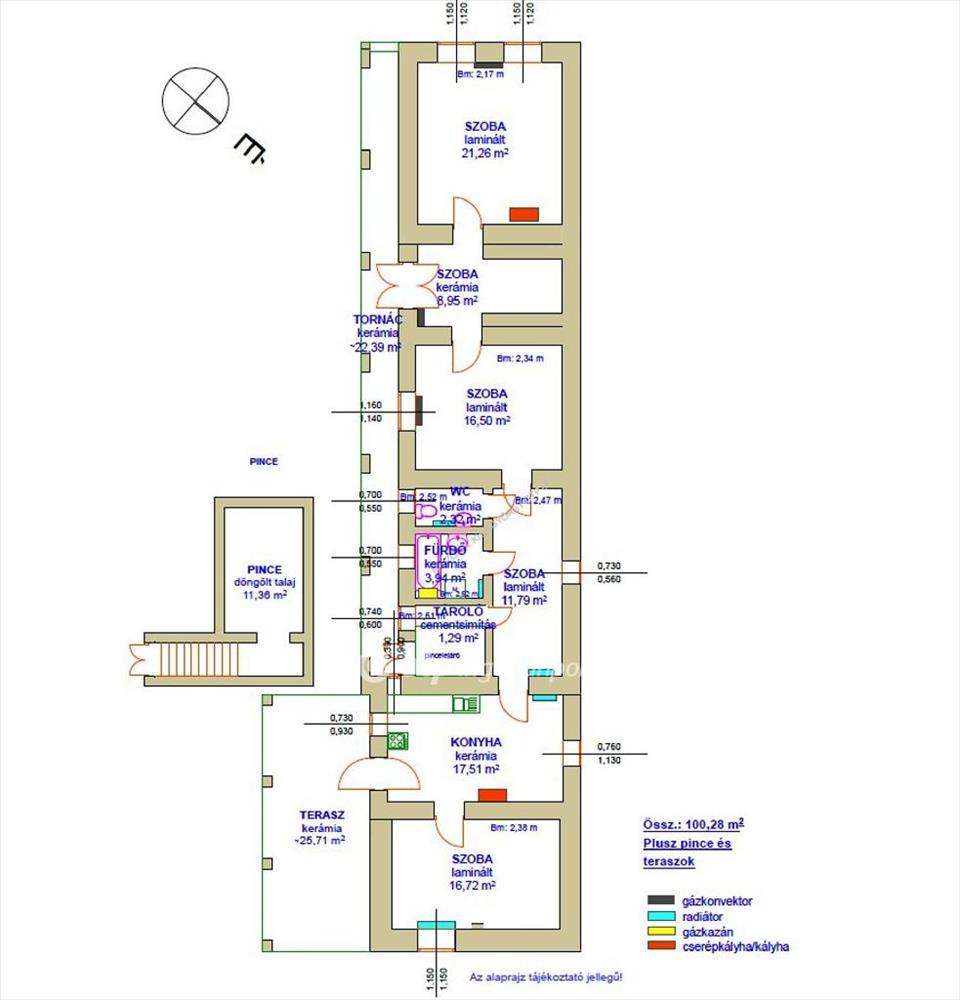 Fűtés: gázkonvektor a ház első részében, hátul gázcirkó radiátorokkal, cserépkályha, kályha.