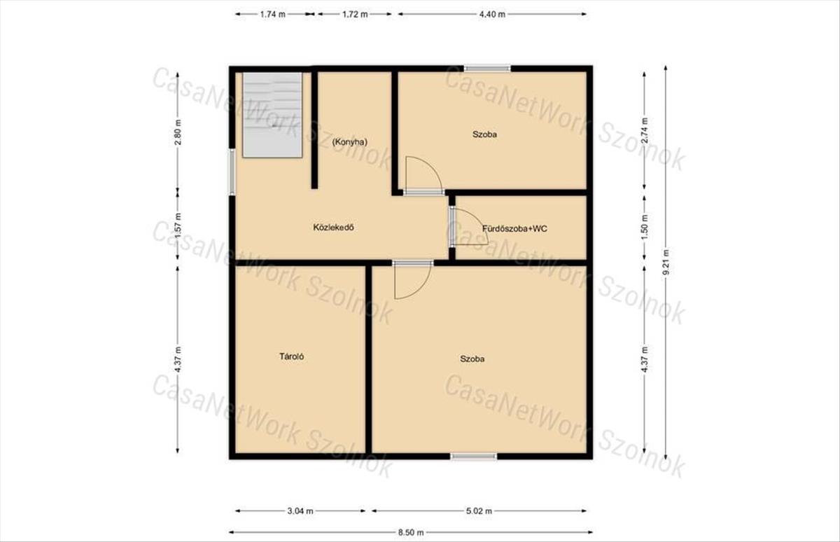 a következő helyiségek kerültek kialakításra : a földszinten: előtér, előszoba, közlekedő, konyha étkezővel, kamra, kazánház, fürdőszoba, wc, 2 szoba; az emeleten: konyha, fürdő+WC, 2 szoba, tároló