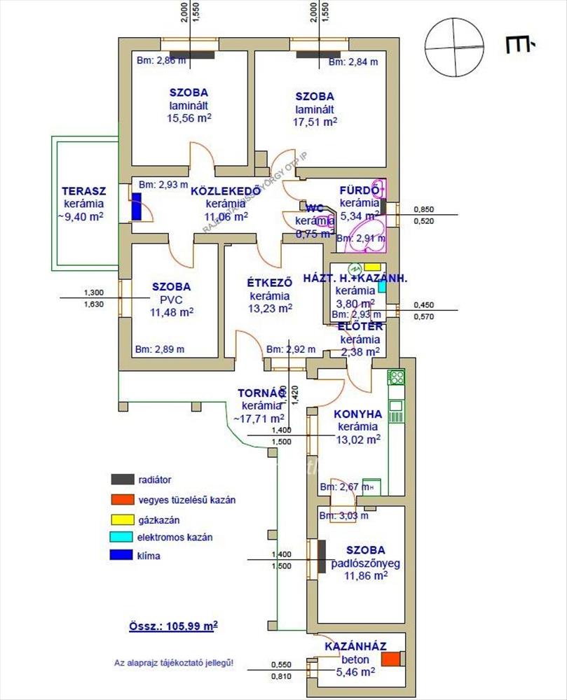 Fűtés: gázkazán, vegyes tüzelésű kazán, elektromos kazán, részben radiátorokkal, részben padlófűtéssel, továbbá 1 db hűtő-fűtő klíma.