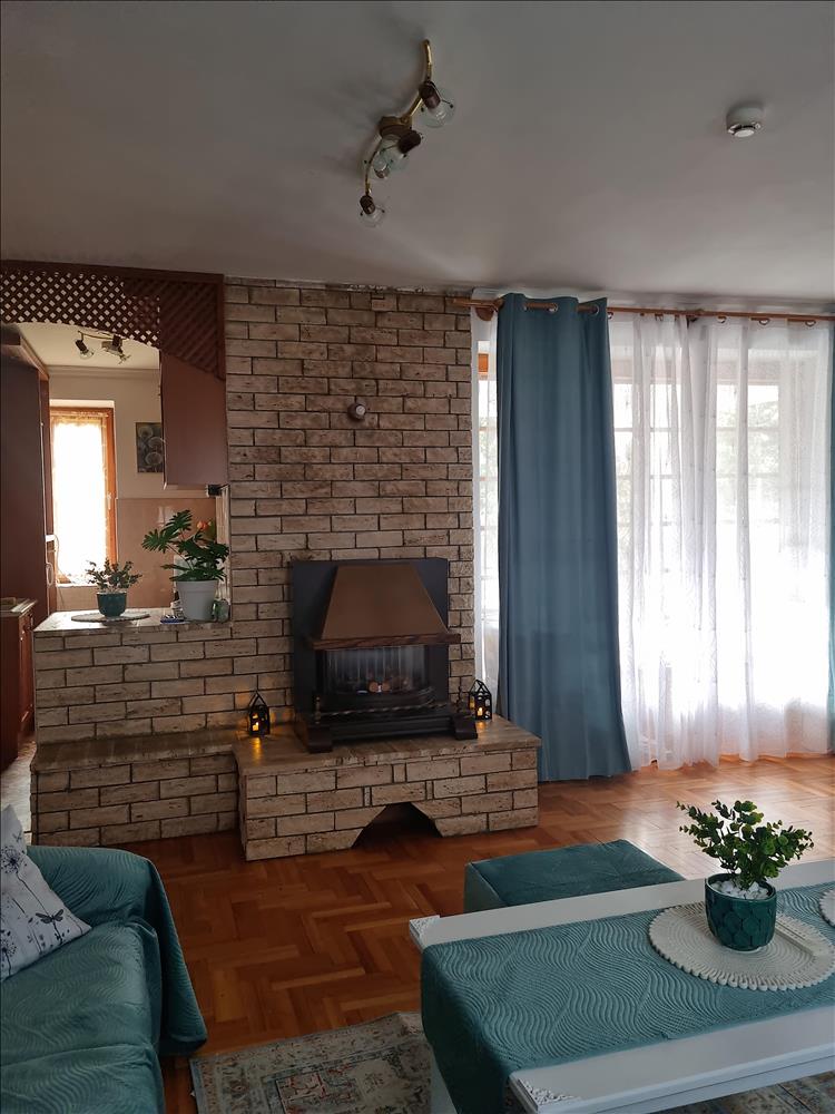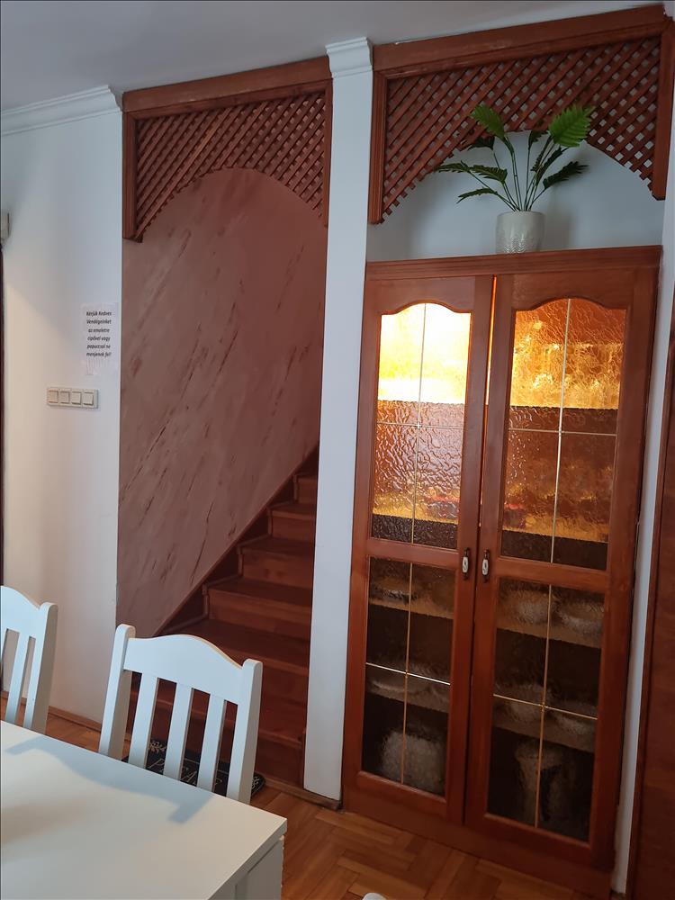 Földszint: Amerikai konyhás, gáz kandallós nappali+ spejz + ebédlő + előszoba + mosdó és terasz, külső kamra helyiség ahol a kazán és a bojler található.