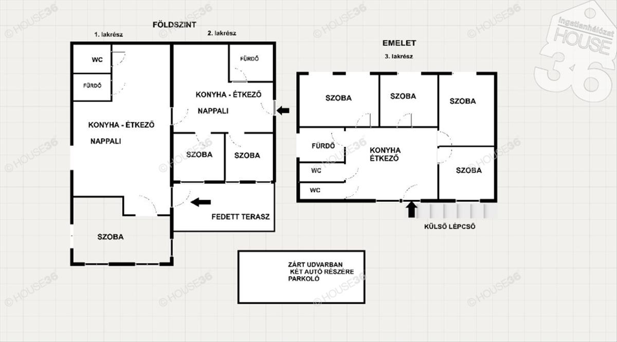Földszinten fedett terasz és két lakrész, míg az emeleten egy lakórész található. Udvarban 2-3 autó számára parkolási lehetőség.