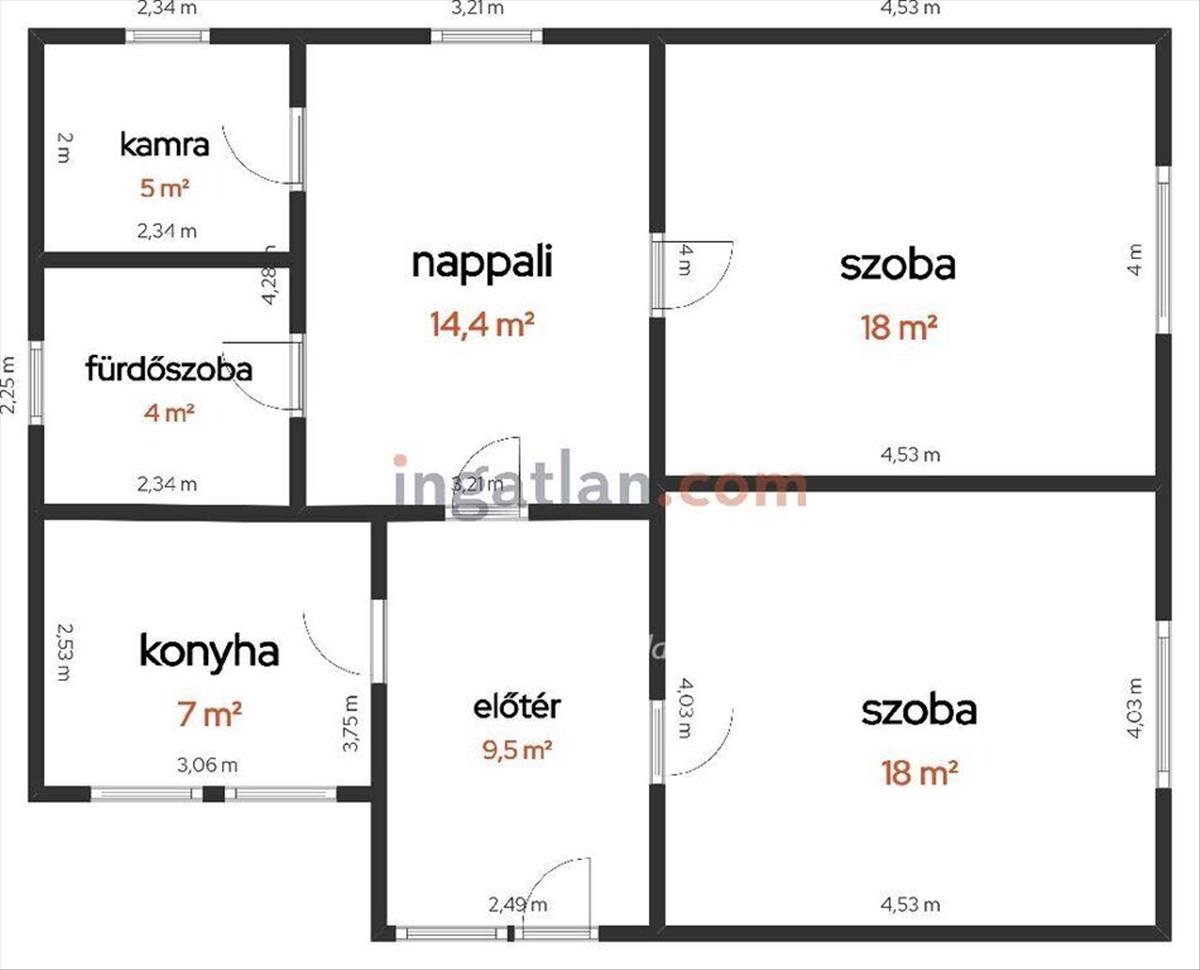 Helyiségek: nappali, két szoba, étkező, konyha, fürdőszoba és kamra.