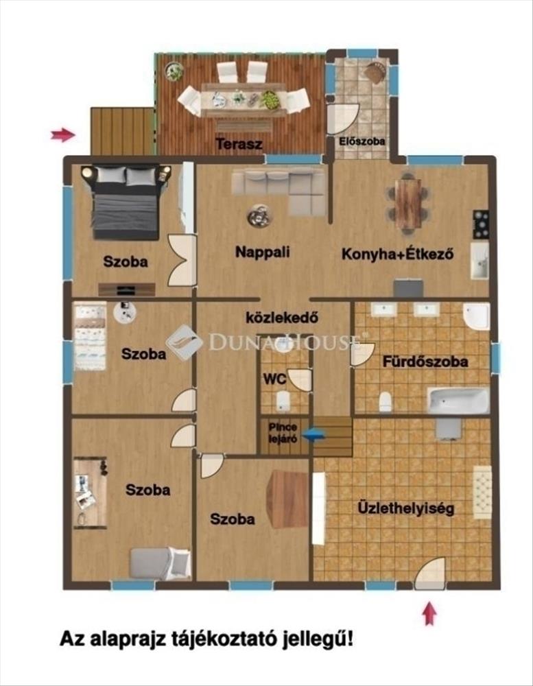 Földszint: Amerikai konyhás nappali + 4 szoba és egy utcafronti üzlethelyiség (szalon).