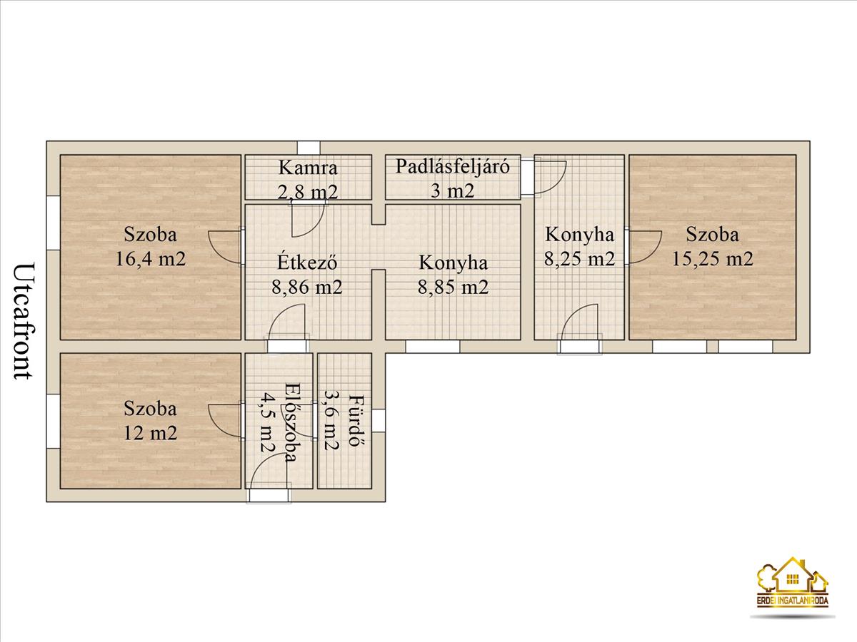 Az ingatlan két bejáratos, 3 szoba, konyha, étkező, fürdőszoba, előszoba, kamra található benne.