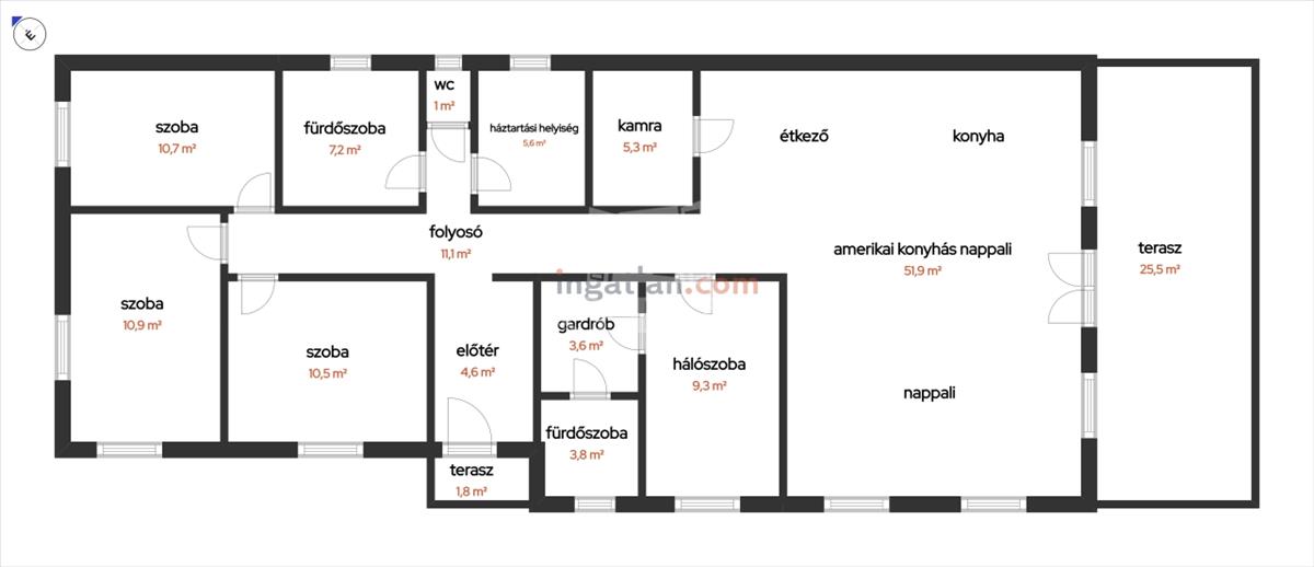 Helyiségei: Előtér 4, 6 nm, amerikaikonyhás nappali teraszkapcsolattal 51, 9 nm (fedett terasz 25, 5 nm), 4 lakószoba egyenként 9, 3 nm, 10, 5 nm, 10, 5 nm, 10, 9 nm, fürdőszoba káddal zuhannyal 7, 2 nm, fürdőszoba zuhanyzóval 3, 8 nm, mosókonyha 5, 6 nm, gardrob 3, 6 nm, közlekedő 11, 1 nm, kamra 5, 3 nm, wc 1. 1 Nm.
