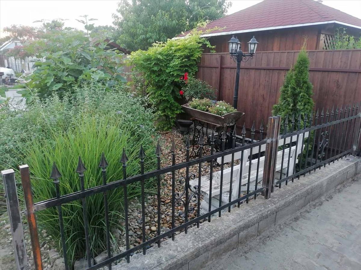 A kertet jelenleg virágok, gyümölcsfák, magas ágyás, mű fű szépít és mindezek gondozásáról fúrtkútról automata öntözőrendszer, csepegtető gondoskodik.